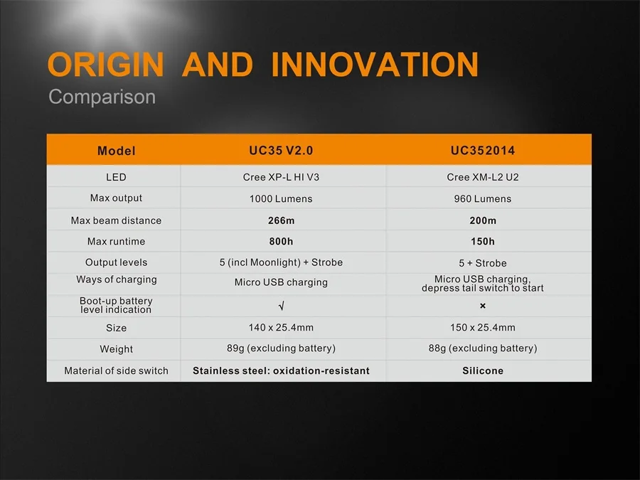 Описание товара Fenix UC35-это тактический, карманный, компактный фонарик с микро-usb зарядкой, с изысканным внешним видом, дальним лучом и одной рукой. Он оснащен CREE XP-L HI V3 светодиодный, который обеспечивает выход до 1000 люмен и максимальное расстояние 872 футов/266 метров. Один тактический задний переключатель и один функциональный боковой переключатель управляют пятью уровнями выхода и режимом стробоскопа. Индикатор уровня заряда батареи обеспечивает хорошую подготовку пользователей к приключениям. В комплект входит литий-ионный аккумулятор 18650 3500 мА · ч, а также совместимость с холодостойкими аккумуляторами CR123, тщательно удовлетворяя требования различных сценариев применения. Fenix UC35 V2.0 является идеальным тактическим фонариком для военных, полицейских, наружного освещения и аварийного режима ожидания. Технические характеристики Использует Cree XP-L HI V3 светодиодный со сроком службы 50000 часов 5V/2A micro USB Перезаряжаемый (только для батарей 18650) Питание от одного перезаряжаемого литий-ионного аккумулятора 18650 или двух неперезаряжаемых батарей CR123A. 5 режимов плюс стробоскоп Турбо: 1000 люмен Высота: 350 люмен Med: 150 люменов Низкий: 50 люменов Лунный свет: 1 люмен Стробоскоп: 1000 люмен Индикатор уровня заряда батареи и предупреждение низкого напряжения (работает только для литий-ионного аккумулятора 18650) Цифровая регулировка выходной постоянной яркости Защита от обратной полярности, защищает от неправильной вставки батареи Стабилизатор поперечной устойчивости и анти-скольжения дизайн кузова Изготовлен из прочного высокопрочного окислительного алюминия Премиум-класса HAIII Жесткий анодированный анти-абразивный финиш Закаленное ультрапрозрачное стекло с антибликовым покрытием Номинальная защита IP68 Аккумуляторы В комплекте: одна батарея повышенной емкости Fenix 18650 (3500 мАч) Рекомендуемые батареи: Одна литий-ионная аккумуляторная батарея 18650 ARB-L18 серии или две батареи CR123A Рекомендуемые зарядные устройства: Зарядные устройства Fenix Размеры Длина-5,5 дюйм (ов) Диаметр-1 дюйм Вес-3,13 унций, за исключением батареи В комплекте Fenix UC35 V2.0 светодиодный перезаряжаемый фонарик Чехол Fenix UC35 V2.0 Кабель Micro USB Fenix 18650 аккумулятор большой емкости (3500 мАч) Два запасных уплотнительных кольца Fenix UC35 V2.0 Руководство пользователя