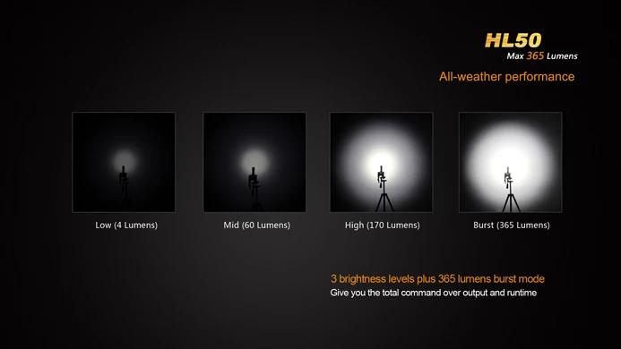 Описание Ультра компактный дизайн и приведенный в действие CR123Abattery, 2-метровый погружной любых погодных условиях и HL50 фары помогает вам достичь новых высот в ваши приключения на свежем воздухе. Фара Fenix HL50 имеет нейтральный белый Выход 365 люменов и возможность использования батарей CR123Aor AA. Вы также можете вынуть осветительную головку для ручного или брелока с всегда готовым HL50. Особенности Светодиодные фонари для подводной охоты Cree XM-L2 T6 нейтральный белый светодиодный со сроком службы 50000 часов · Использует одну батарею 3V CR123ALithium или AA (Ni-MH, щелочную) батарею · 63,8 мм ×, маленького размера, круглой формы с диаметром 32 мм × 30 мм (2,51 дюймов x 1,26 дюймов x 1,18 дюймов) · Вес 57 грамм (1,83 унций) (без аккумулятора) · Цифровой регулируемый выход-поддерживает постоянную яркость · Защита от обратной полярности для защиты от неправильной установки батареи · Полнофункциональный переключатель в головке для легкой и быстрой работы · Высокий выходной режим burst · Изготовлен из качественного алюминиевого сплава и нержавеющей стали · Премиум Тип III Жесткий анодированный анти-абразивный финиш · Закаленное ультрапрозрачное стекло с антибликовым покрытием Входит в посылка 1 * HL50 налобный фонарь 1 * повязка на голову 1 * АА удлинитель 1 * запасное уплотнительное кольцо 1 * Руководство пользователя 1 * Гарантийный талон