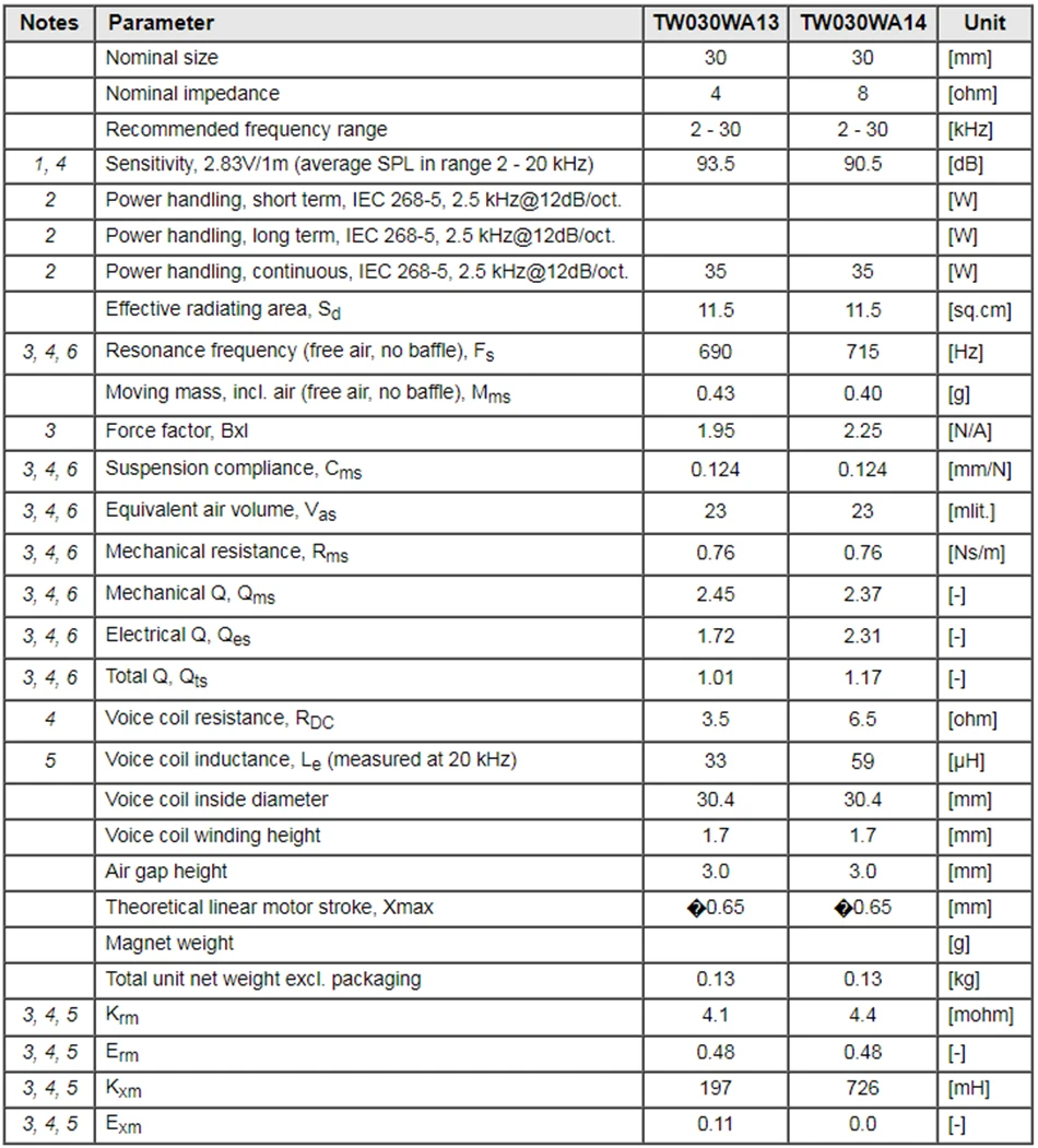 TW030WA13 и TW030WA14 являются настоящими высококлассными твитерами, разработанными для самых требовательных приложений с набором улучшенных характеристик, которые принимают участие в получении низкорезонансной частоты, низких искажений и очень высокочастотного расширения