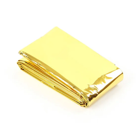 Название продукта: термоодеяло первой помощи Модель: AT9034 Материал: PET Материал Параметры: 210*160 см Толщина: около 0,012 мм Вес: 55 г Цвет: золото Один размер: 14*8,5*2,5 см Особенности: Изготовлен из новейших изоляционных материалов, хорошая теплоизоляция, используется в условиях низкой температуры, Может играть роль согревания, положить кусок в спальный мешок, эффект изоляции очень хороший; Эффективно отражает солнечный свет и тепло в жарком состоянии, поддерживая температуру тела; сильное отражение, Спасателям легче найти, Это международный аварийный спасательный инструмент, необходимый для активного отдыха, инспекций и туризма.