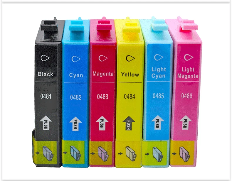 1, модель: T0481 T0482 T0483 T0484 T0485 T0486 Цвет: черный, голубой, Megenta, желтый, Ligh Cyan, Light Megenta Объем чернил: K/C/M/Y/LC/LY 17 мл Характеристики: новый совместимый чернильный картридж Гарантия: 18 месяцев 2. Чернильные картриджи совместимы с моделями принтеров ниже: Стилус фото R200 R300 R340 R300 R300M R320 RX500 RX600 RX620 RX640.