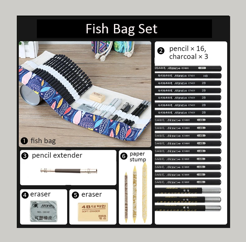 1 * сумка для карандашей 12 шт Карандаш (B, HB, 2B, 4B, 6B, 8B) 3 * Угольные карандаши (мягкие, средние, жесткие) 1 * разминаемый ластик (для угольных карандашей) 1 * ластик стирательная резинка 1 * Инструмент для удлинения карандаша 3 * Бумага для удаления пней