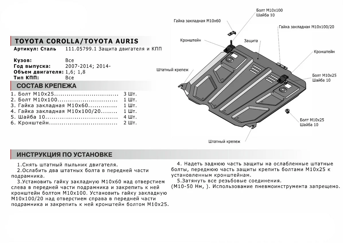 Защита картера и КПП АвтоБроня подходит для: Toyota Auris I (V - 1.6; 1.8) 2006-2010 Toyota Auris I рестайлинг (V - 1.6; 1.8) 2010-2012 Toyota Auris II (V - 1.6; 1.8) 2012-2015 Toyota Corolla E140, E150 (V - 1.6; 1.8) 2006-2012 Toyota Corolla E140, E150 рестайлинг (V - 1.6; 1.8) 2010-2013 Toyota Corolla E160, E170 (V - 1.6; 1.8) 2012-2016 Toyota Corolla E160, E170 рестайлинг (V - 1.6) 2016-2019 Материал - сталь 1,8 мм. Штамповка - есть. Цвет - черный. Крепеж - в комплекте. Листов (частей) - 1. Артикул - 111.05799.1 Стальные защиты АвтоБроня надежно защищают ваш автомобиль от повреждений при наезде на бордюры, выступающие канализационные люки, кромки поврежденного асфальта или при ремонте дорог, не говоря уже о загородных дорогах. - Имеют оптимальное соотношение цена-качество. - Спроектированы с учетом особенностей автомобиля, что делает установку удобной. - Защита устанавливается в штатные места кузова автомобиля. - Является надежной защитой для важных элементов на протяжении долгих лет. - Глубокий штамп дополнительно усиливает конструкцию защиты. - Подштамповка в местах крепления защищает крепеж от срезания. - В комплекте инструкция по установке.