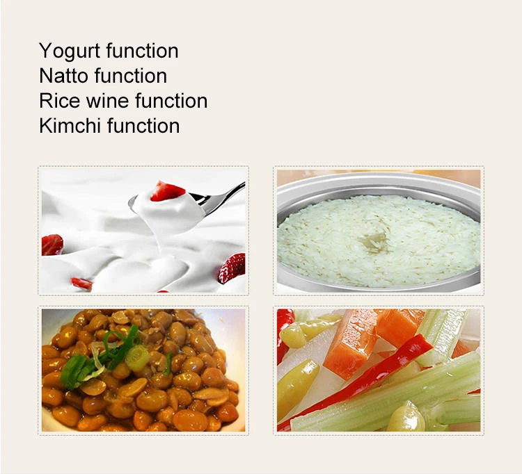 Название продукта: йогурт рисовое вино машина для Натто Функция охлаждения: интеллектуальное охлаждение Номинальная мощность: 1.2L Длина провода: 120 см Вес нетто: около 2,8 кг Температура охлаждения: 3-8 ° (температура окружающей среды> 30 °C будет иметь отклонение) Стандартный конфигурации: 1 хост + 1,2 литров стальная желчь 1 + 2 Натто брожения пластины Номинальная мощность: ферментация 20 Вт Охлаждение 55 Вт Размер изделия: 250*205*210 мм Режим работы: сенсорный микрокомпьютер Функция: natto, йогурт, рисовое вино, kimchi, функция холодного хранения