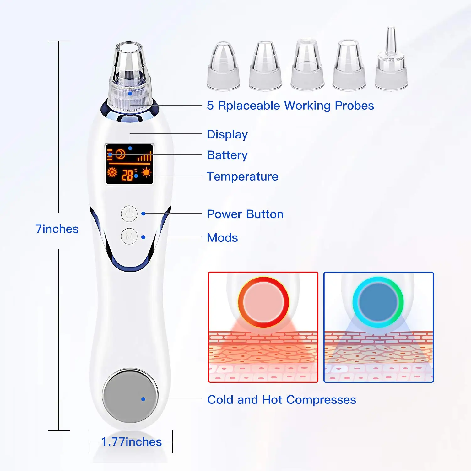 Вакуум пор предназначен для горячего и холодного сжатия, что может помочь охладить кожу и решить проблему фиолетовых и красных полос путем регулировки температуры машины. 5 взаимозаменяемых зондов с 5 регулируемыми режимами всасывания эффективны для жирной или сухой кожи и могут помочь вам насладиться профессиональным спа-уходом за кожей дома или в путешествиях.