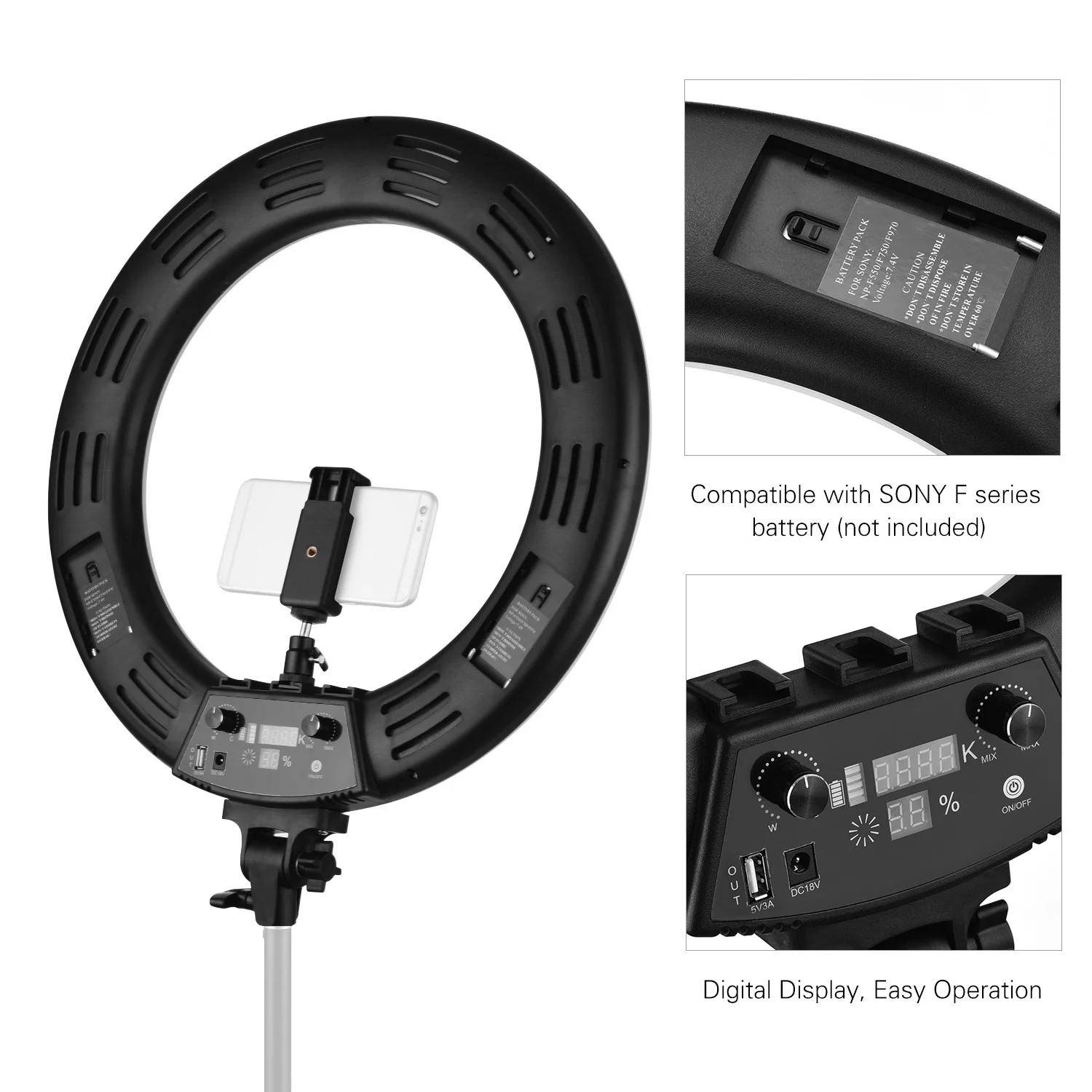 Светодиодный кольцевой светильник 18 дюймов для фотосъемки, заполняющий светильник, штатив-светильник 60 Вт 3000-6000 К + держатель для телефона с шаровой головкой для макияжа