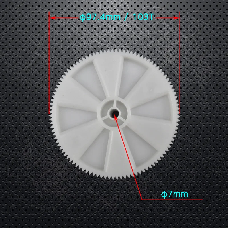 Материал: POM посылка содержит 1 зубчатое колесо: 103/10 маленький диаметр шестерни: 18,7 мм большой диаметр шестерни: 97,4 мм Диаметр отверстия: 7,0 мм Высота: 33,4 мм