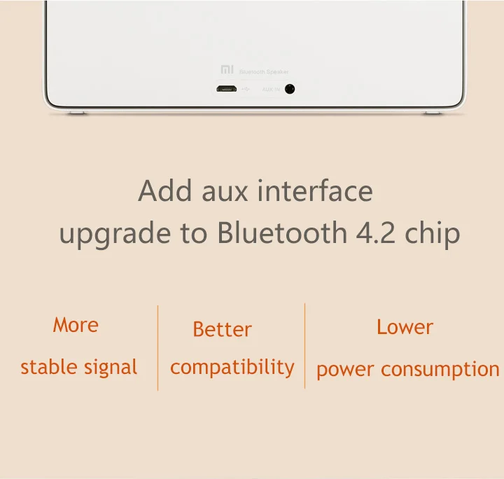 Добавьте интерфейс AUX, вы можете использовать аудиокабель для подключения к оборудованию со стандартным интерфейсом AUX, таким как компьютер, мобильный телефон, MP3-плеер и т. д.; Обновление до чипа Bluetooth 4,2, по сравнению с millet box Bluetooth динамик поколения, сигнал более стабильный, совместимость лучше, и потребление энергии ниже