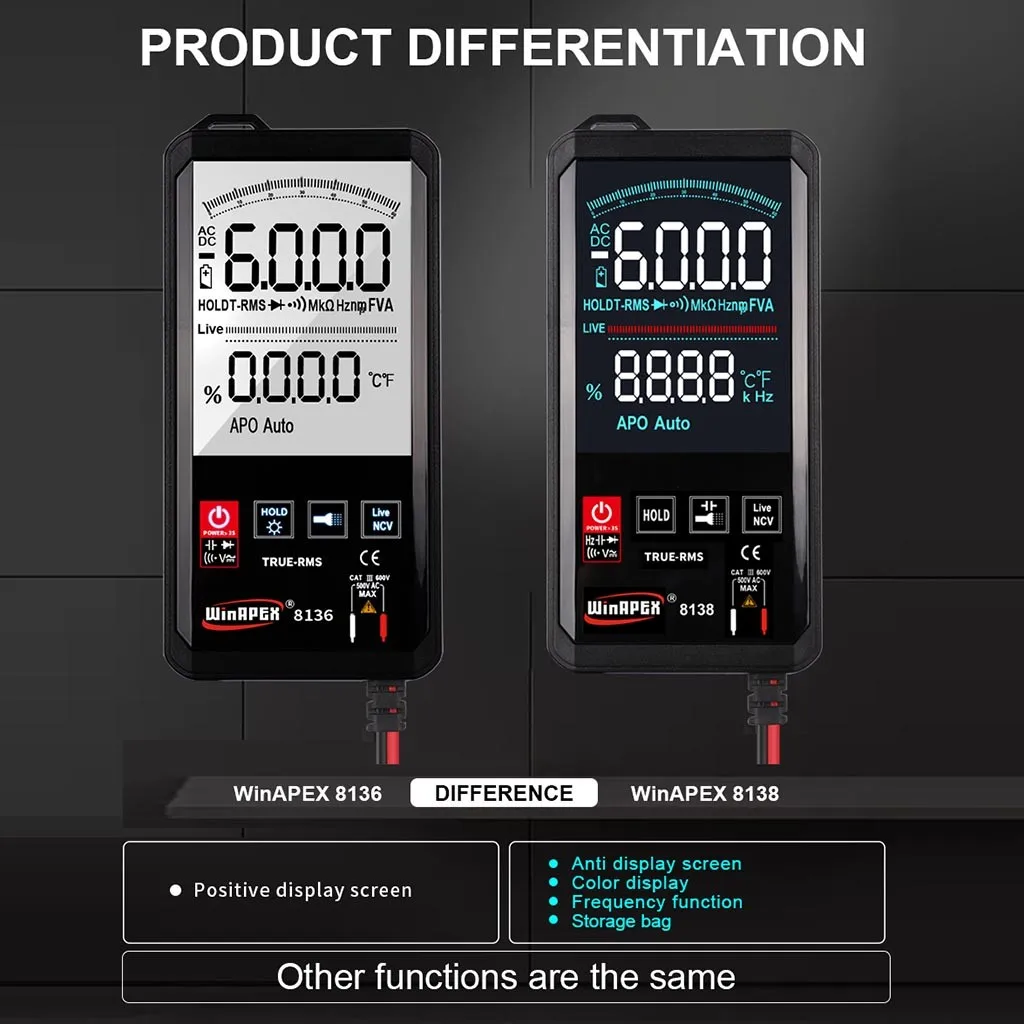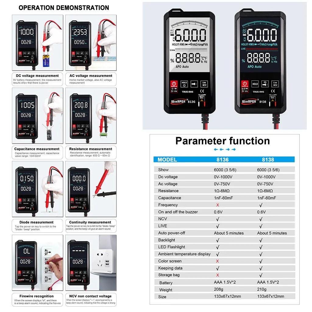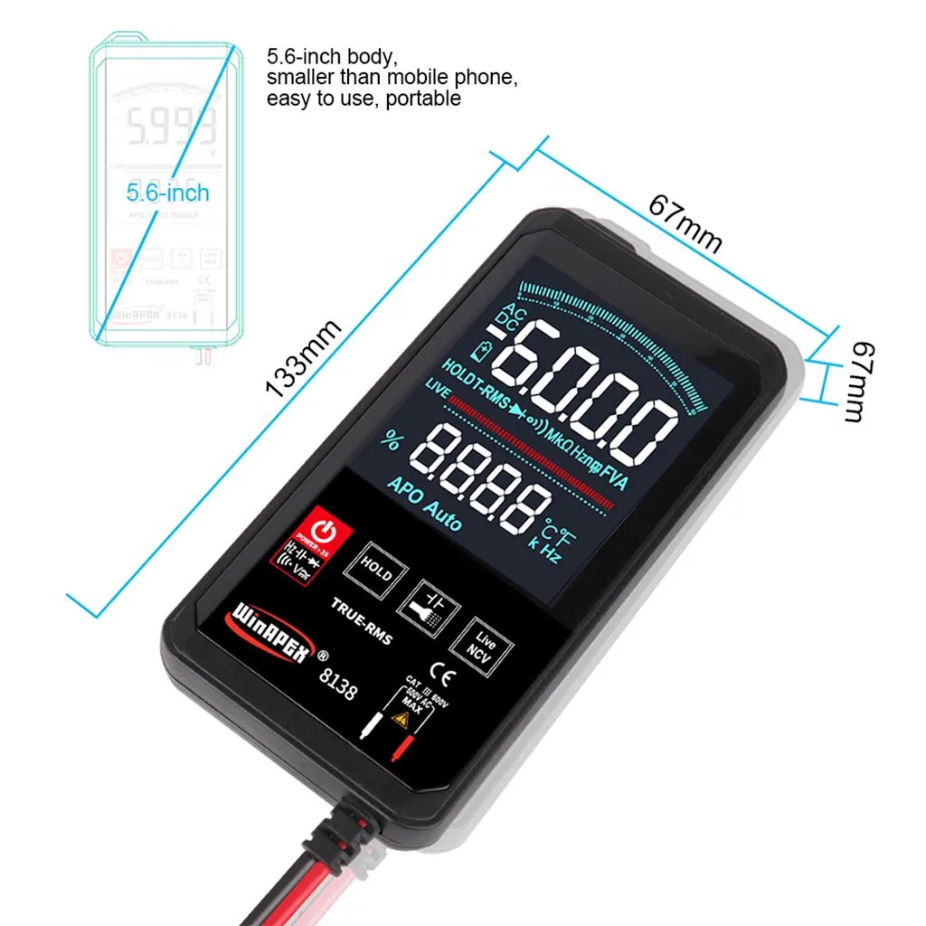 Карманный 3/5/6 цифр истинное эффективное значение интеллектуальное сканирование цифровой измеритель Он может быть вручную переключен для измерения напряжения постоянного тока и напряжения переменного тока, емкости, электрического поля, определения живого провода, диода, испытания на непрерывность и других параметров, является инструментом с превосходной производительностью Идеальный инструмент для лабораторий, фабрик, радио энтузиастов и семей Режим отображения: тройной дисплей жидкокристаллический дисплей; Основной дисплей, вспомогательный дисплей, аналоговый бар Максимальный дисплей: 5999 (5 5/6) цифровой автоматический дисплей полярности Метод измерения: двойное интегральное преобразование A/D Частота выборки: около 3 раз в секунду Операционной бесперебойный источник функция Рабочая среда: (0 ~ 40)℃, относительная влажность <80% Источник питания: аккумулятор AAA 2X1.5V (не входит в комплект)Пакет Включает в себя: