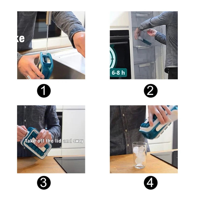 1. Перед использованием Вымойте лоток для льда. 2. Так как объем воды увеличится после замерзания, необходимо лишь добавить около 80% чистой воды в кубик льда 3. Вымойте лоток для льда после использования и храните в сухом и прохладном месте.