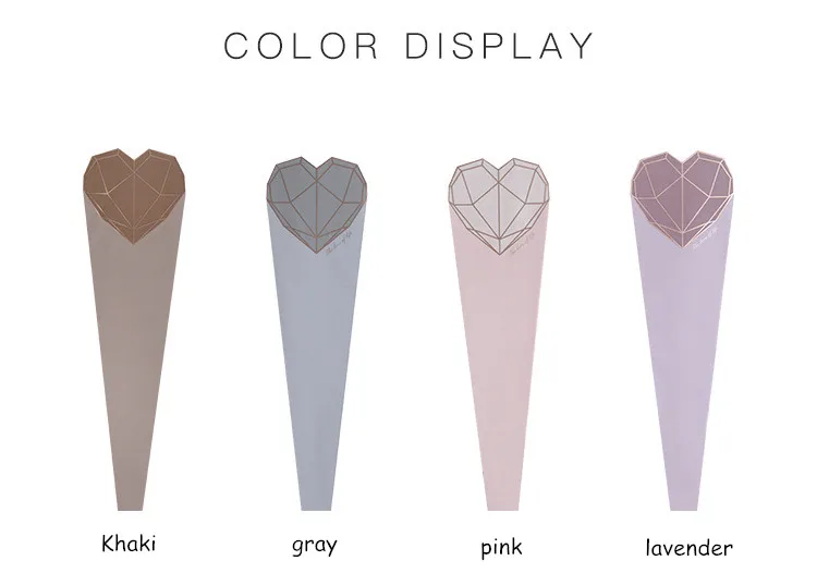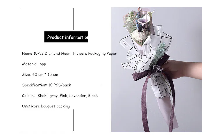 Name:10Pcs Diamond Heart Flowers Packaging Paper Material: opp Size: 60 cm * 15 cm Specification: 10 PCS/pack Colours: Khaki, gray, Pink, Lavender, Black Use: Rose bouquet packing