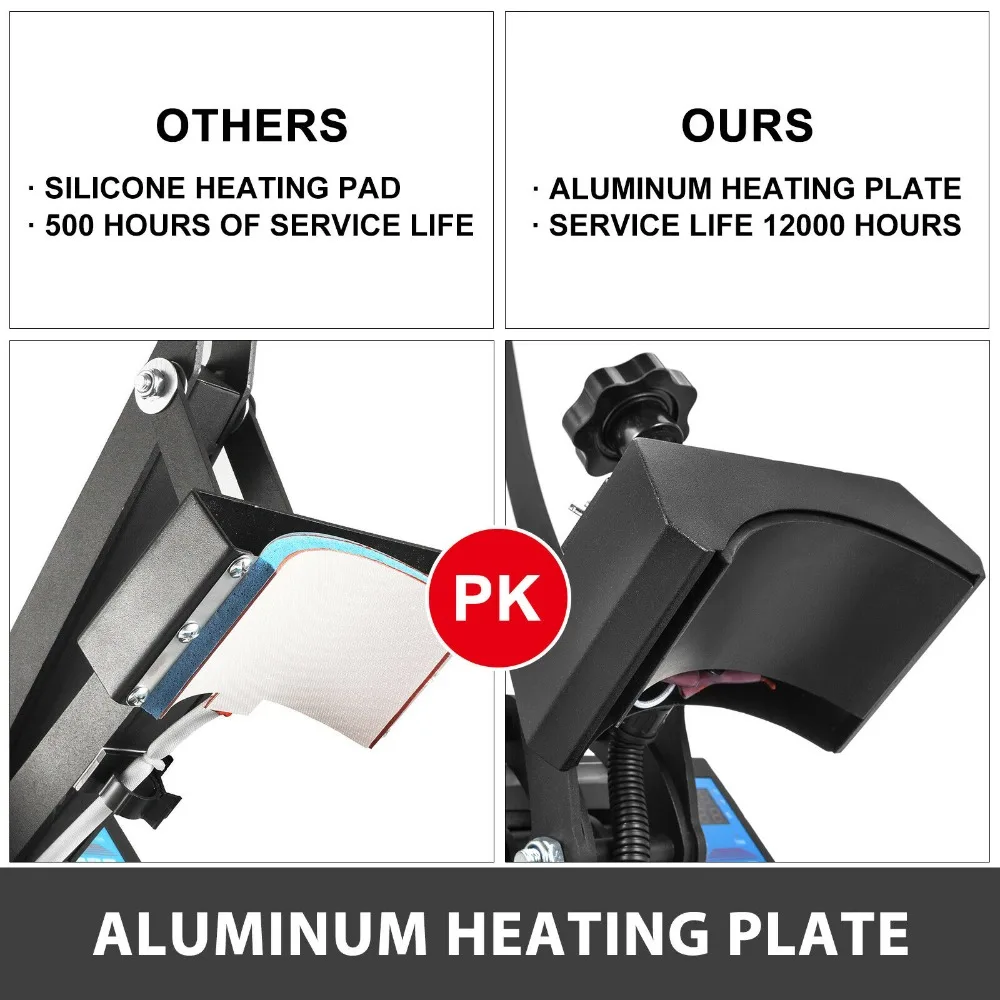 【Алюминиевая плита 】-отличается от других продуктов на рынке, наш тепловой пресс принимает литье алюминиевой пластины. Он имеет длительный срок службы 12000 часов, 11500 часов дольше, чем у других поставщиков, которые используют обычный силиконовые грелки.