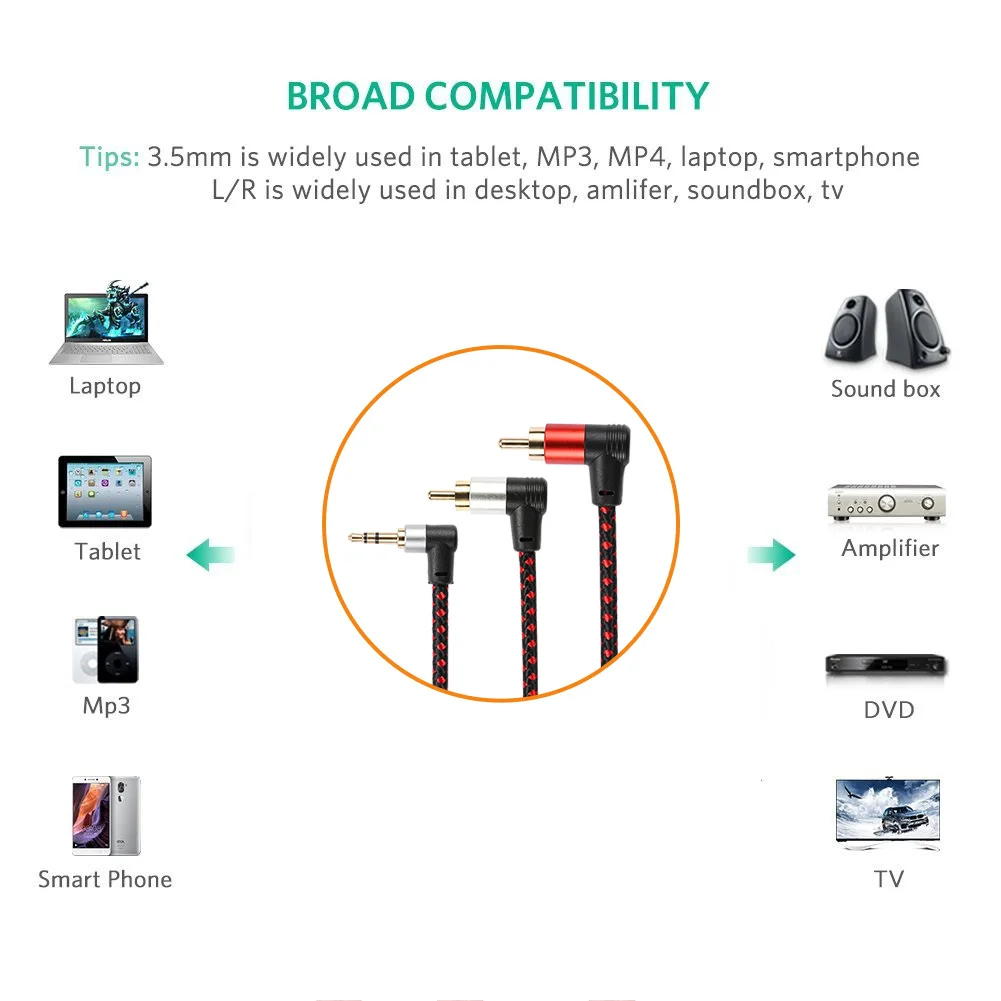1. Этот кабель RCA-1/8 совместим с iPhone, iPod, iPad, планшетами, в том числе для Google Nexus, Samsung, MP3-плееров, CD-плееров, ноутбуков, планшетные компьютеры и любые другие цифровые устройства с 3,5 мм аудио разъем и ваш стерео приемника или колонки, видеомагнитофон, dvd-плеер, ТВ, Wii коробка, видеокамера, AV ресивер, усилитель, проектор, радио-сабвуфер, XBOX 360, PS3,Wii, HD TV, Dolby цифровой ресивер, DTS декодер, Мини диск, ТВ, Wii box, видеокамера, видеомагнитофон и многое другое.