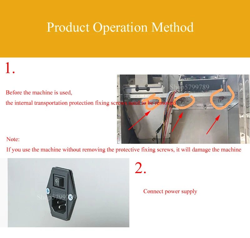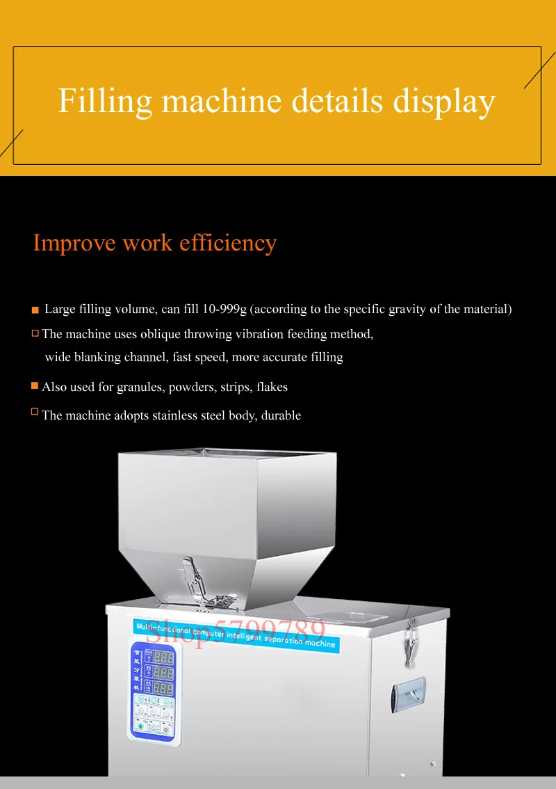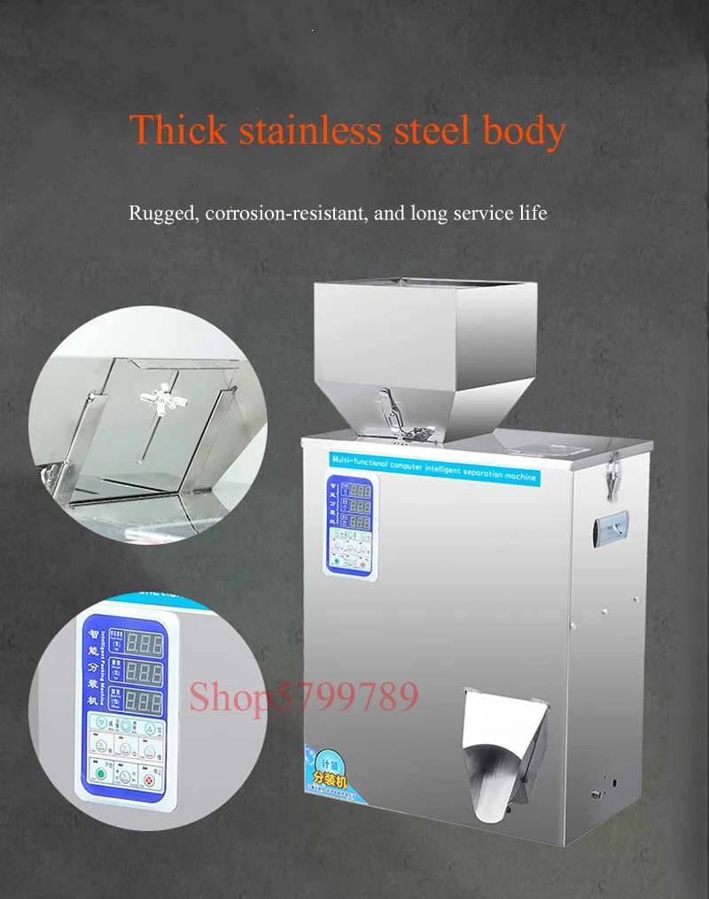 Напряжение: 110 В/220 В Мощность: 350 Вт Диапазон заполнения: 10-999 г Емкость бункера: 15 кг (Возьмите рис в качестве справки) Скорость заполнения: 8-20 раз/мин Ошибка взвешивания: ± 0,5 г Размер: 470*270*820 мм Вес: 17 кг