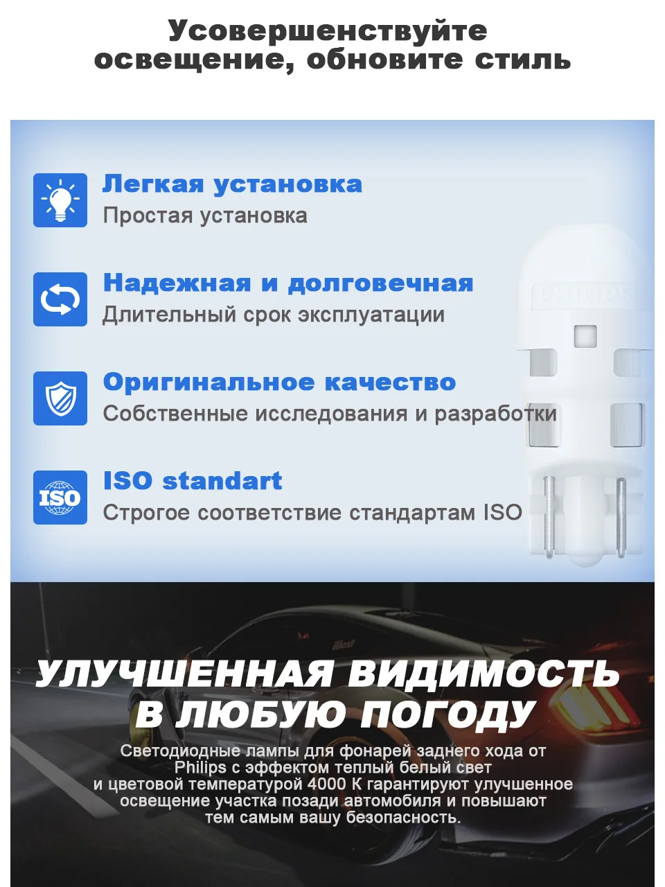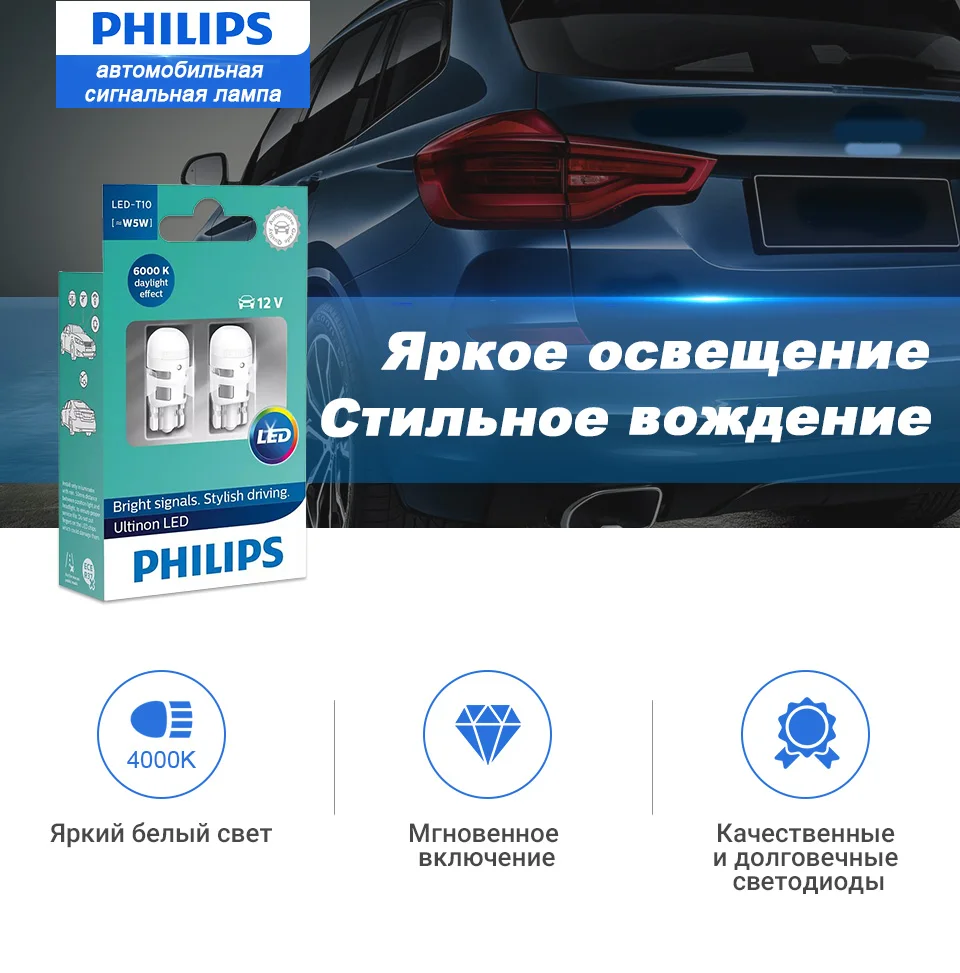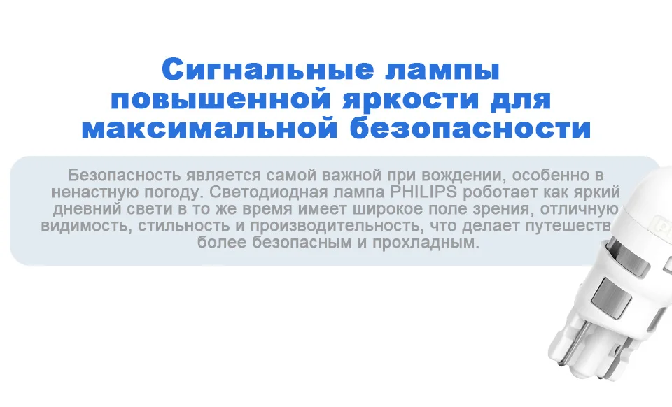 Сигнальные лампы повышенной яркости для максимальной безопасностиДля соблюдения безопасности крайне важно сообщать о ваших маневрах на дороге. Чтобы избежать столкновения, другие водители должны знать о ваших намерениях. Благодаря яркому сигнальному освещению вас лучше видно, и, следовательно, вождение становится более безопасным. Все сигнальные светодиодные лампы Philips Ultinon LED (для фонарей заднего хода, габаритных огней и стоп-сигналов) гарантируют высокую эффективность работы, и благодаря им у других водителей будет больше времени среагировать на ваши действия.