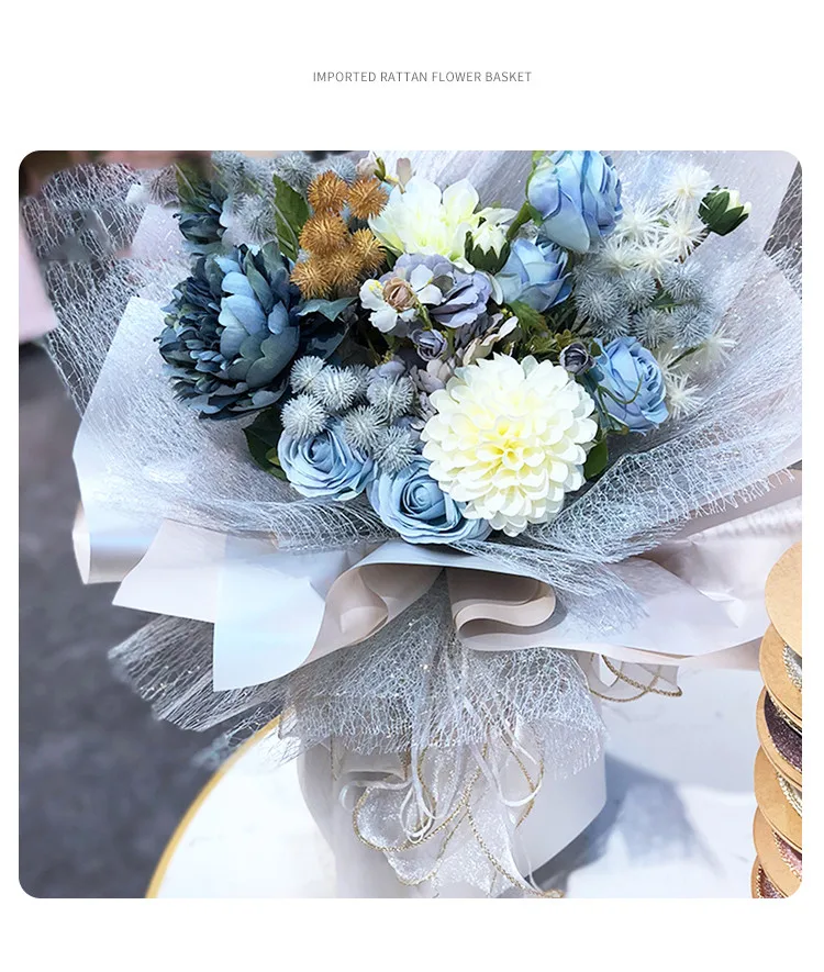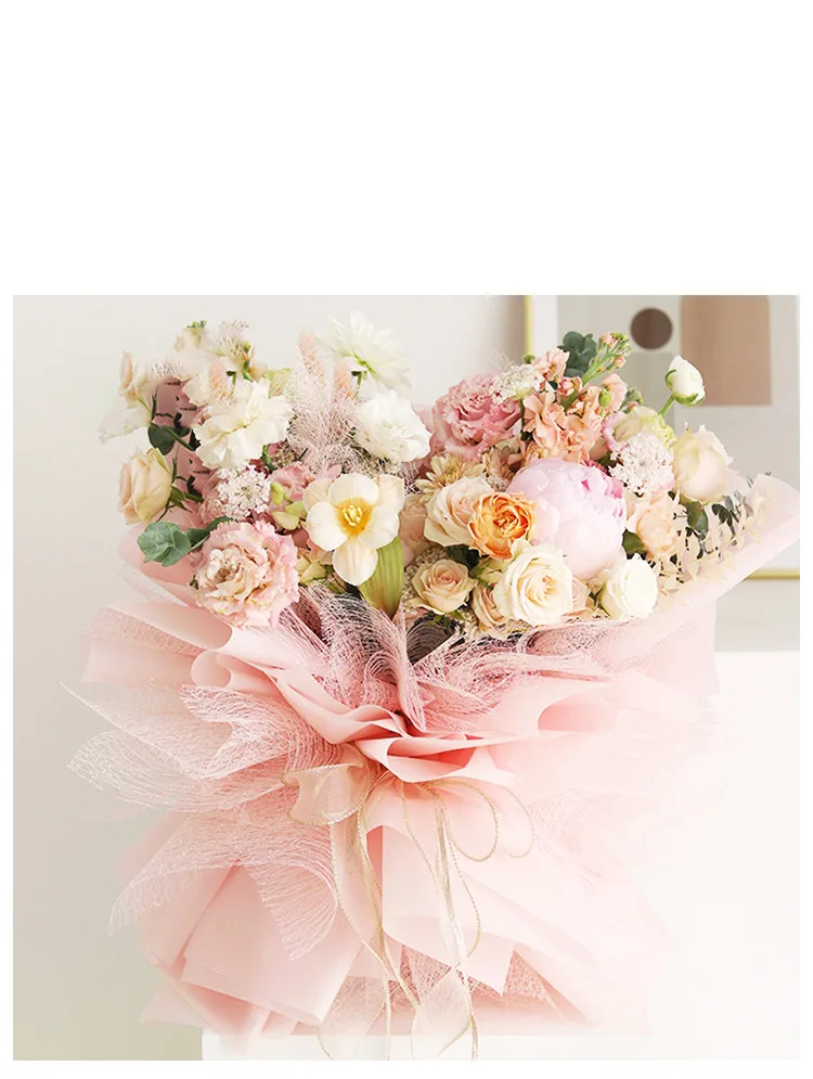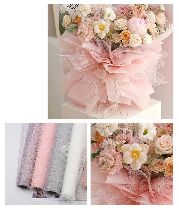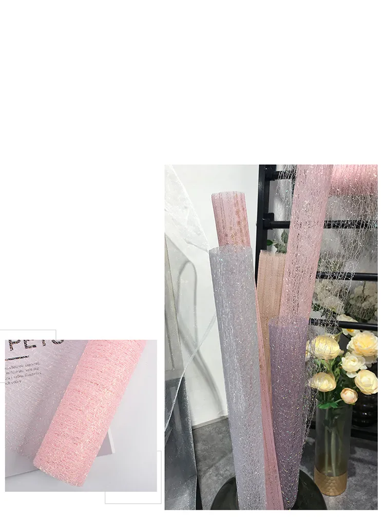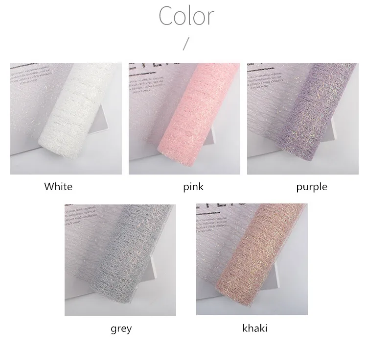 Название: 4,5 м * 50 см/рулон Радуга из пряжи и тюля, упаковка Материал: полиэфирная Чистая Пряжа Цвет: белый, розовый, серый, хаки, фиолетовый Размер: 4,5 м * 50 см Использование: марля для упаковки свежих цветов, декоративные принадлежности