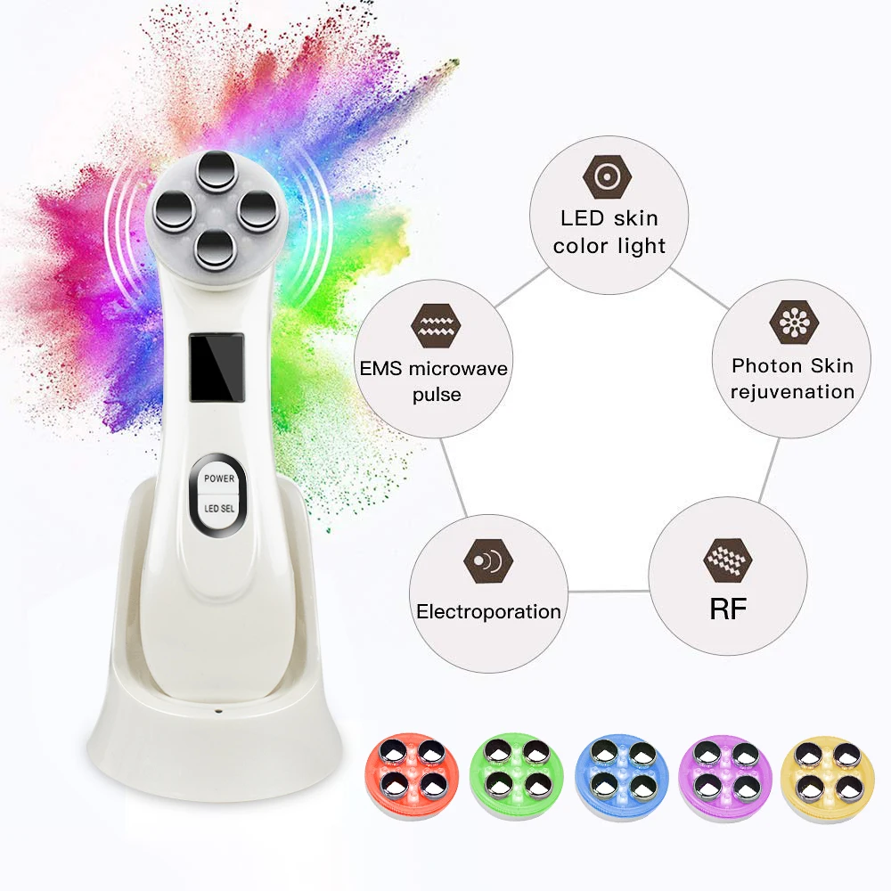 Особенности: 1. Используйте 3 раза в неделю в течение 10 минут каждый раз. 2. Легко носить, можно держать в руке. 3. Подходит для поврежденной УФ, подверженной акне, поврежденной кожи, смягчает линии и морщины, предотвращает старение кожи, против пигментации кожи. 4. Подходит для: лица/переносицы носа/лба/подбородка/окуляра и ухода за морщинками. Светодиодный свет используется для обеспечения безболезненного ухода за кожей, который уплотняет кожу, повышая производство коллагена и лечит от легкой и умеренной акне. 5 ламп могут решить проблему кожи: красный свет (620 нм): способствует регенерации коллагена, эластичности кожи, подходит для морщин кожи. Зеленый свет (520 нм): применяется для подавления меланина кожи для отбеливания кожи. Синий свет (415 нм): удаляет акне, сужает поры, улучшает жир кожи, устраняет и рестрирует бактерии пор. Желтый свет (590 нм): кожа, осветляет, предотвращает аллергию. Розовый свет (700 нм): отбеливает кожу, подходит для тусклых сложных кожи. Розовый мигающий: усиленное поглощение жидкости или геля красоты. Порядок использования: 1. Вставьте usb-кабель в устройство. 2. Очистите лицо, нанесите сыворотку или крем на лицо. 3. Нажмите выключатель питания для регулировки уровня интенсивности. Нажмите один раз означает низкий уровень интенсивности 1; Дважды в неделю третьей/четыре/пять раз означает Уровень 2/3/4/5; Шесть раз выключения устройства. 4. Нажмите кнопку LED SEL, чтобы выбрать различные светодиодные лампы. Нажмите один раз-красный свет; Дважды/три/четыре/пять/шесть раз-зеленый/синий/желтый/розовый/мигающий розовый; Семь раз, чтобы выключить светодиодный режим. 5. Медленно перемещайте устройство к своему лицу. Устройство автоматически отключится через 10 минут использования. Советы: внимательно прочитайте руководство перед использованием. Комплектация: 1 x RF EMS косметический инструмент 1 x USB 1 x Зарядное устройство 1 x руководство на английском языке