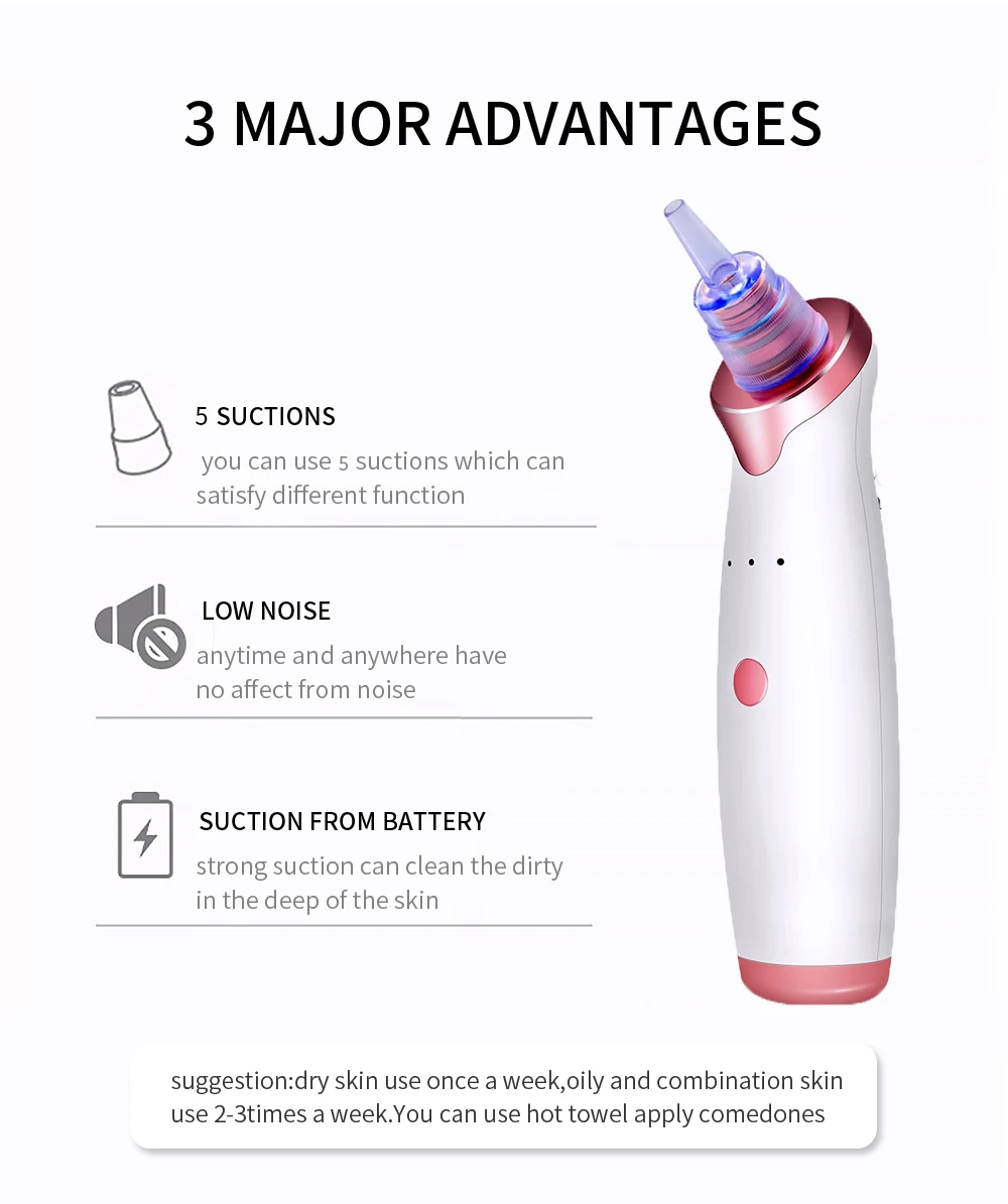 Особенности: 1.[Безопасный и эффективный] использует инновационную усовершенствованную технологию вакуумного поглощения для супер сильного всасывания, чтобы без труда высасывать угри, белки, омертвевшую кожу, остатки макияжа, акне и прыщи, не повреждая кожу, не раздражает и безболезненно, чтобы избежать побочных эффектов. 2.[многоцелевое применение] 3 регулируемых уровня всасывания и 5 сменных всасывающих головок для свободной регулировки, широко подходит для различных типов кожи и работает на различных областях кожи, полностью отвечает вашим требованиям по очистке пор. 3.[простота в эксплуатации] одна кнопка управления, вы можете удобно включить/выключить и переключить этапы всасывания, удобный для использования для мгновенного удовольствия. 4.[Стабильная мощность] Встроенный полимерный аккумулятор емкостью 380 мА · ч может заряжаться от USB зарядки, вы можете практически получить доступ к источнику питания через ПК, планшетный компьютер, адаптер, внешний аккумулятор и другие устройства с поддержкой USB. 5.[надежное качество] эргономичный Обтекаемый корпус и высококачественный АБС-материал позволяют удобно держать ручки, прочный для длительного использования. 6.[компактный размер] Легкий и портативный дизайн, подходит для домашнего и туристического использования с переноской бриз. Технические характеристики Материал: АБС-Пластик Цвет корпуса: белый Рабочее напряжение: 5 В сила всасывания: 62 кПа Напряжение зарядки: 5 В Входная мощность: 2,5 Вт Номинальное напряжение: 3,7 в Тип аккумулятора: 380 мА · ч перезаряжаемый Полимерный аккумулятор Источник питания: USB Время зарядки: около 90 мин Вес нетто: 125 г комплектация: 1 * вакуумный Электрический Очиститель черных точек (основной блок) 5 * сменная всасывающая головка 1 * USB Кабель