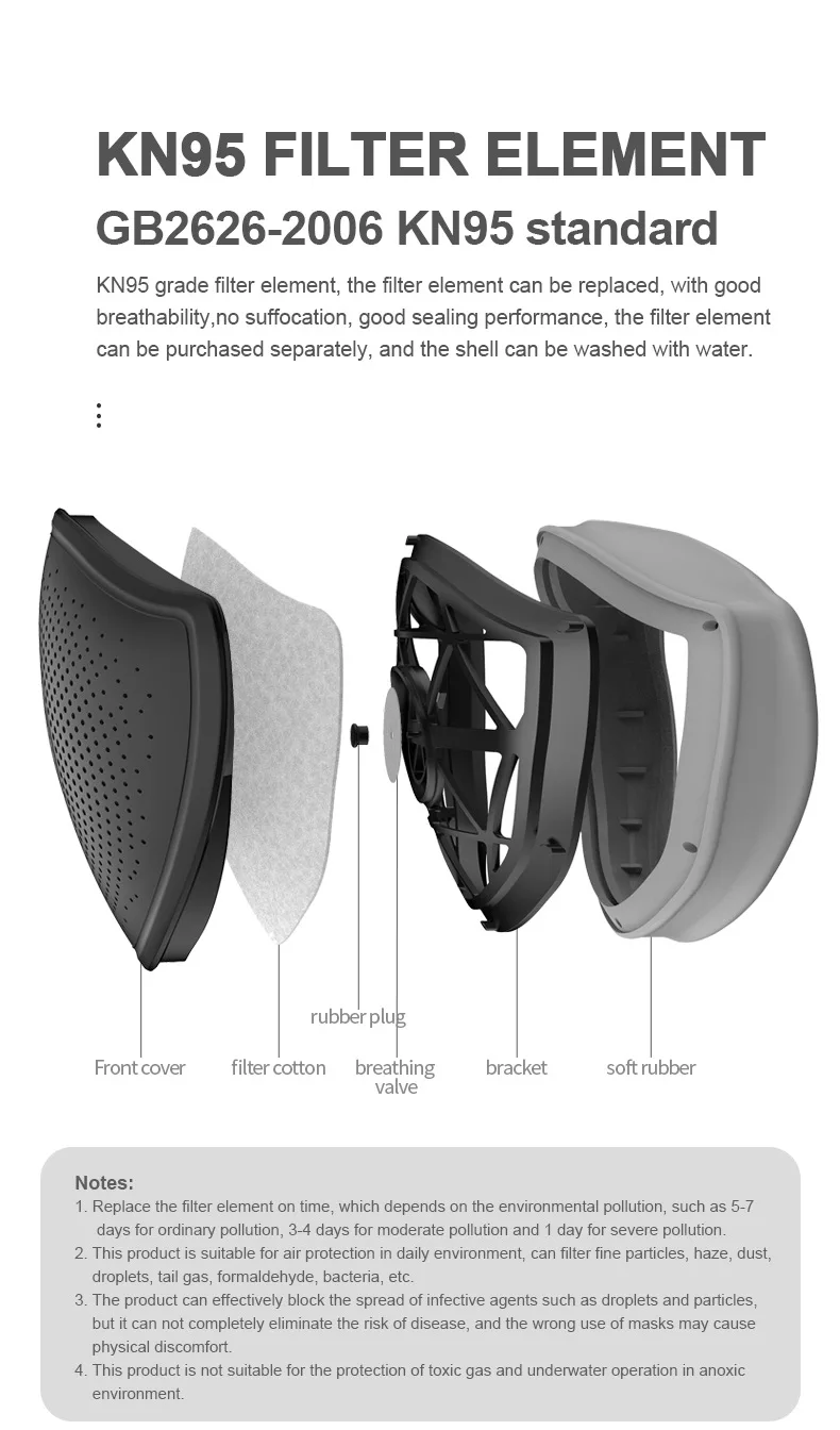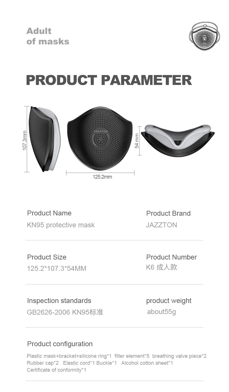 Конфигурация продукта: маска * 1, ядро * 5, дыхание * 2, эластичная веревка * 1, пряжка * 1, спиртовой хлопок * 1 сертификат * 1.