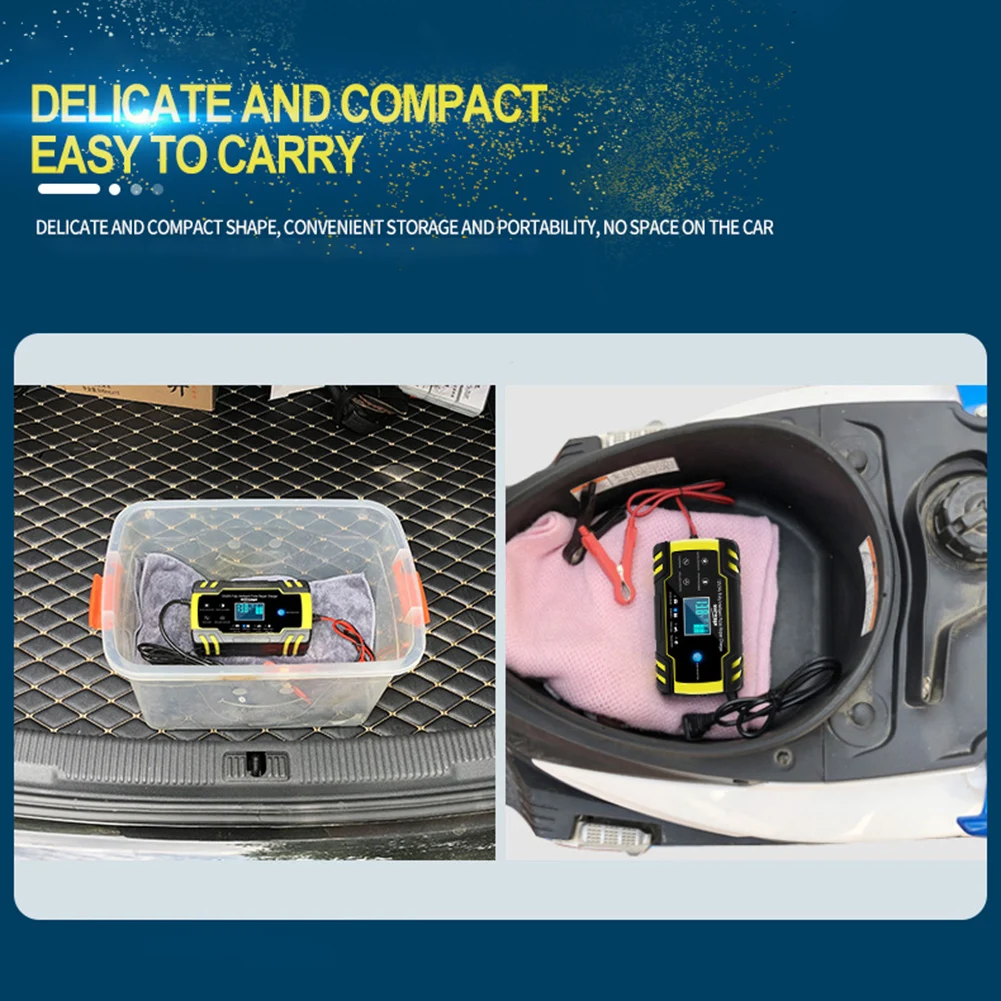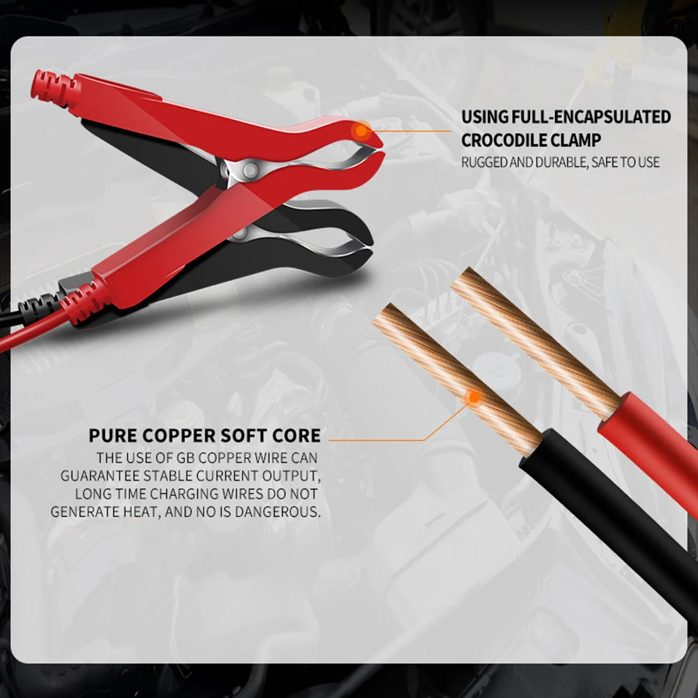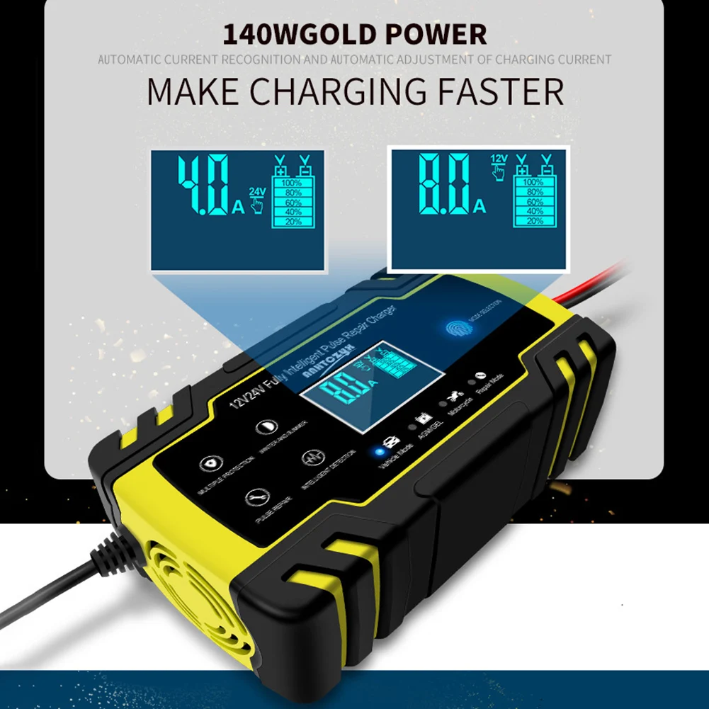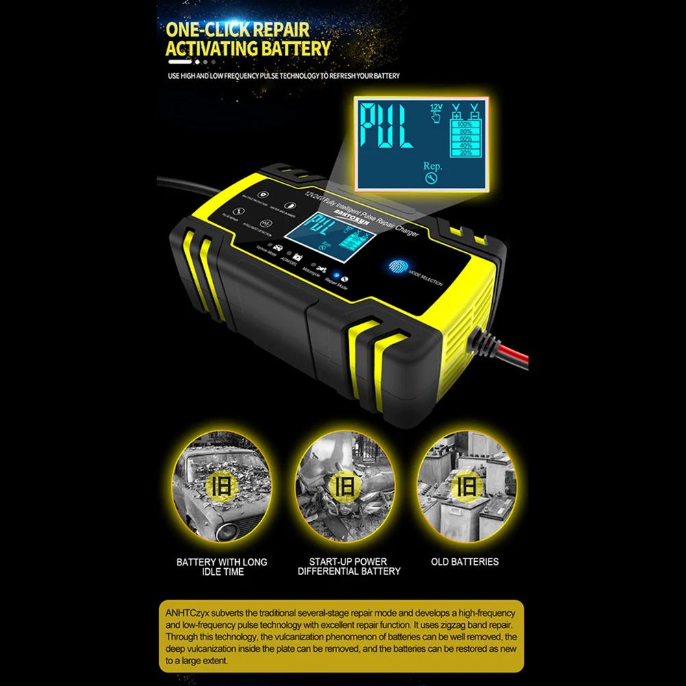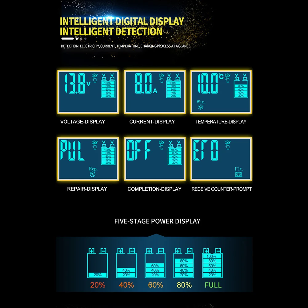 * 5. Зарядное устройство подходит для большинства типов аккумуляторов, включая кальций, гель и AGM, влажные аккумуляторы. Они также могут помочь восстановить истощенные и сульфатные батареи.