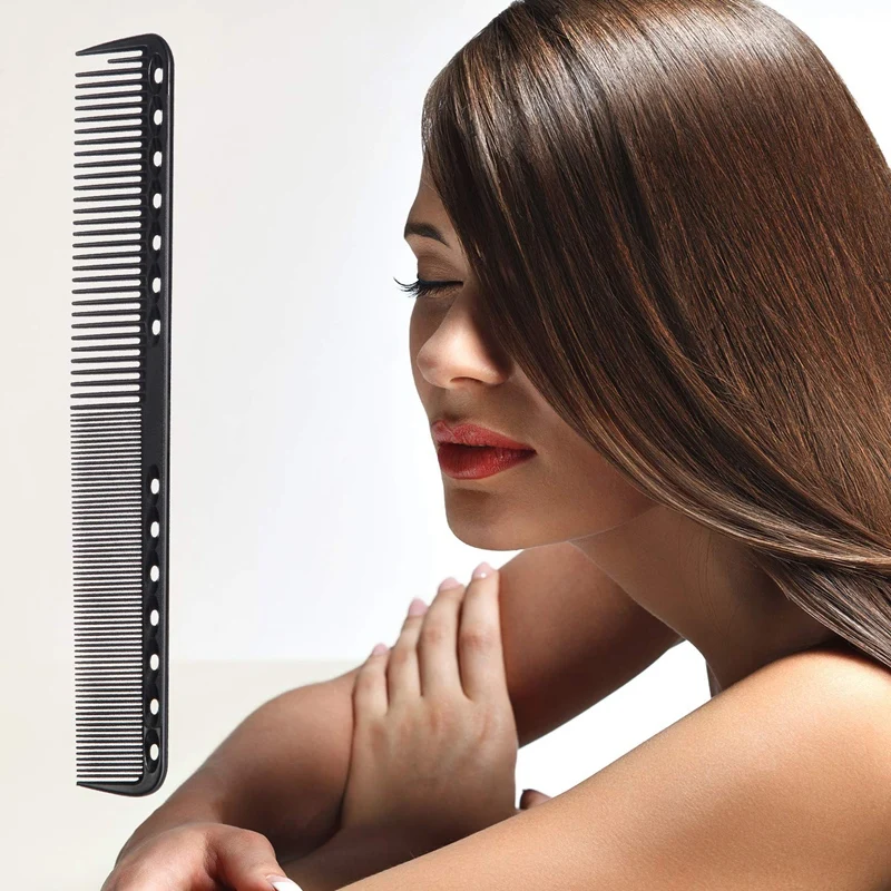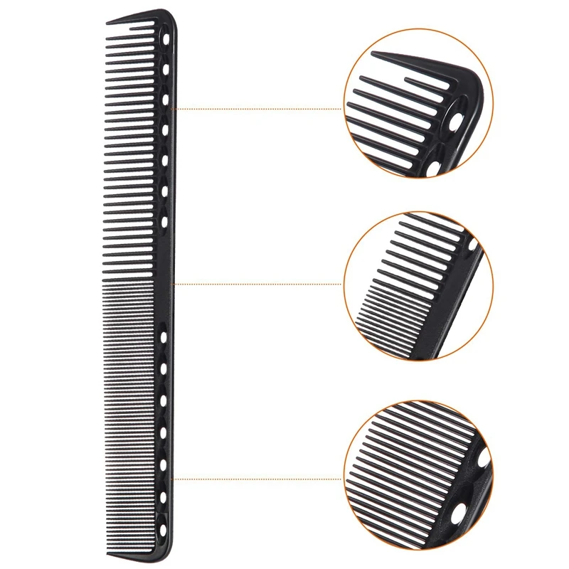 Характеристики: черная расческа для резки, термостойкая и антистатическая, наша расческа для резки имеет мелко разделенную и стандартную конструкцию зубьев и углеродную шлифовку для теплостойкости и предотвращения статического воздействия.