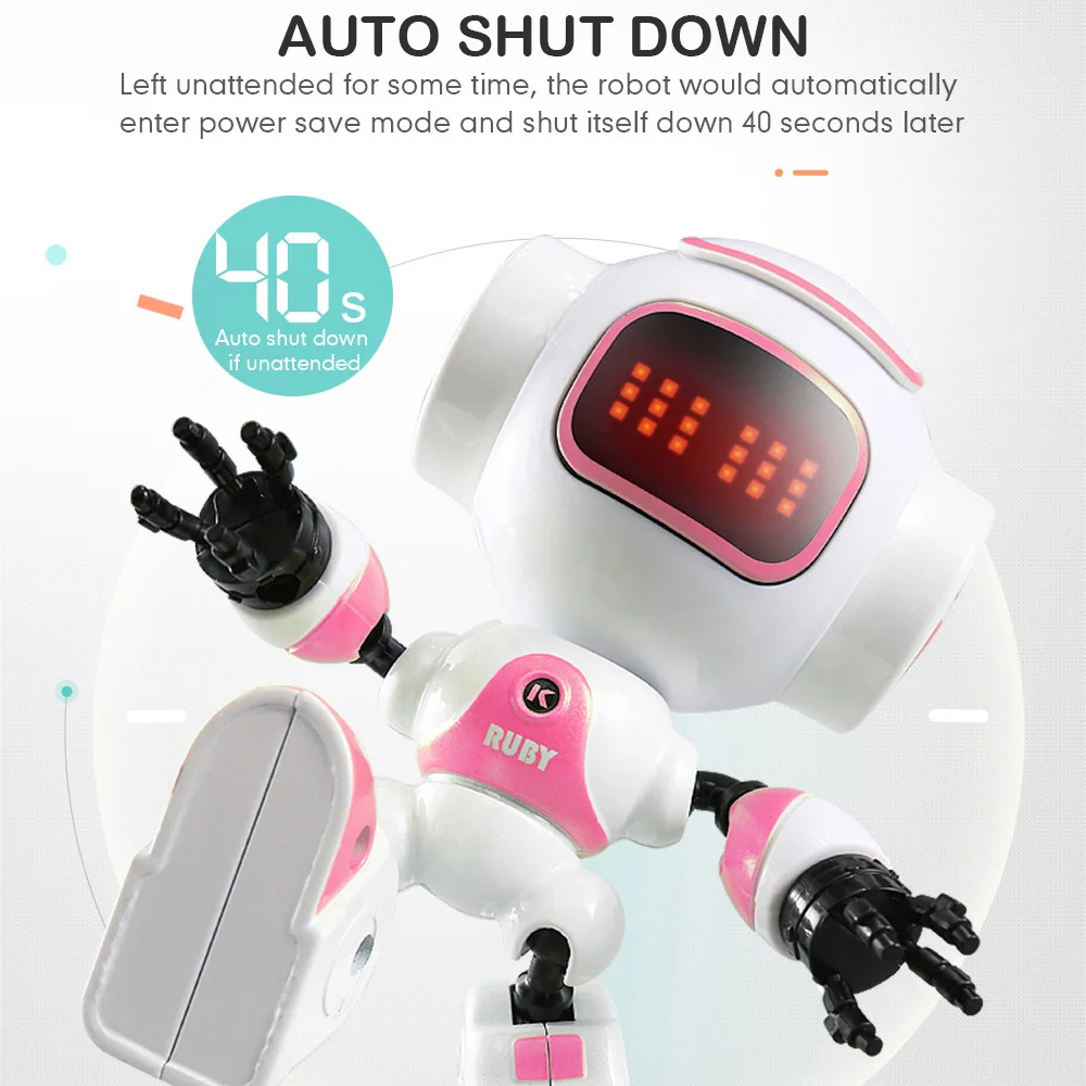 Note 1: There could be some deviations due to manual measurement or slight color difference as the result of shooting sceneNote 2: The name of the robot may be either RUBY or LUBY, random delivered.Features:Multi-function: Talk, LED eyes, DIY gesture, Hold cellphone, Auto shut down.Head Touchable Mode: Hand on its head, and the robot will react with sounds and movements of eye expressions.
