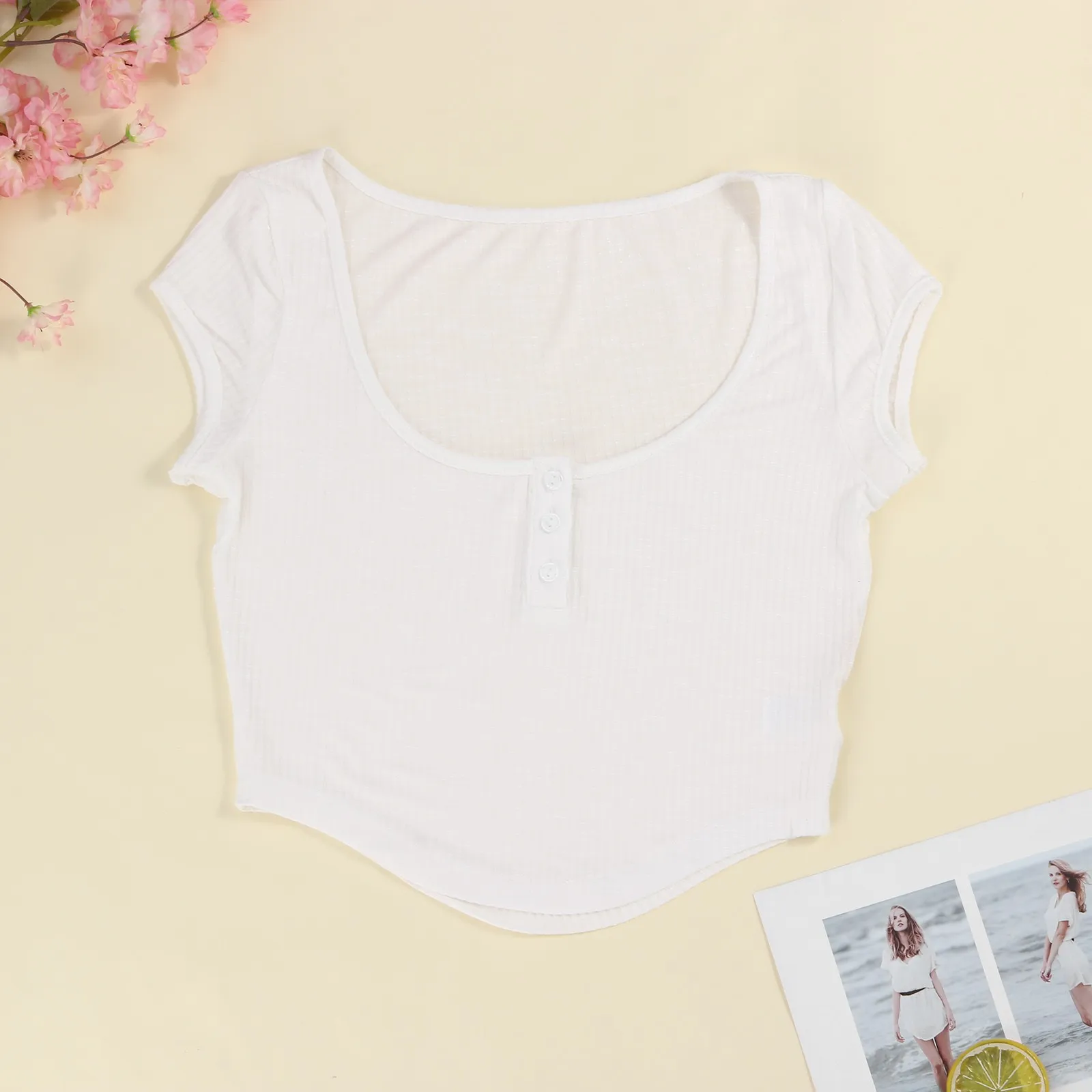 Женская сексуальная блуза до пупка с коротким рукавом и низким воротником, милая брендовая футболка для отдыха
