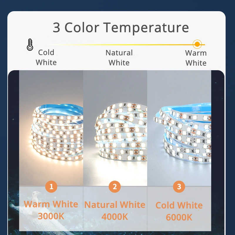 Цветовая температура: теплый белый (3000-3500K), натуральный белый (4000-4500K), холодный белый (6000-6500K).