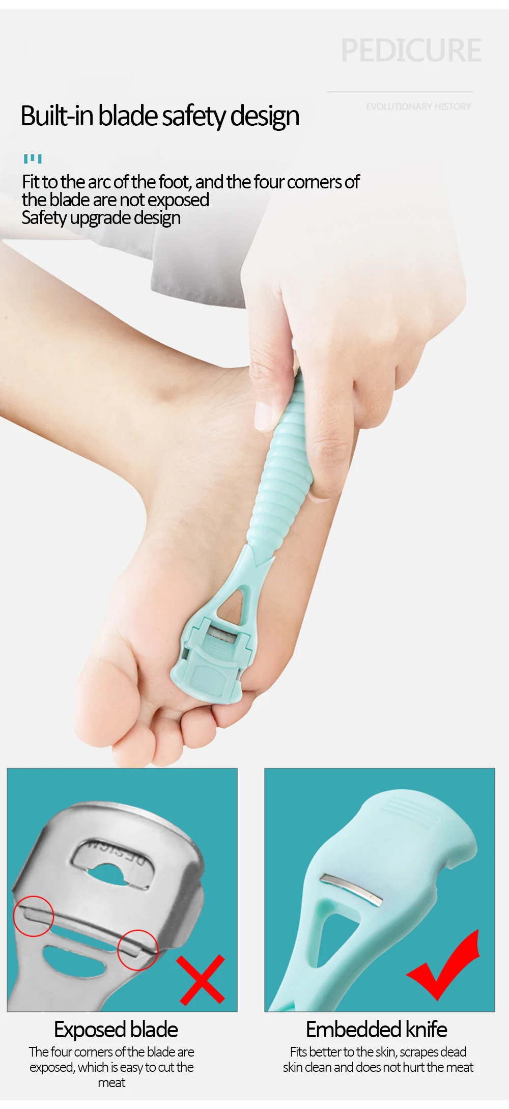 2. Простой в использовании дизайн лезвия, подходит для подошвы форма ног, использование более безопасных и больших усилий, эффективное удаление роговой, также может быть использован для царапин ног.