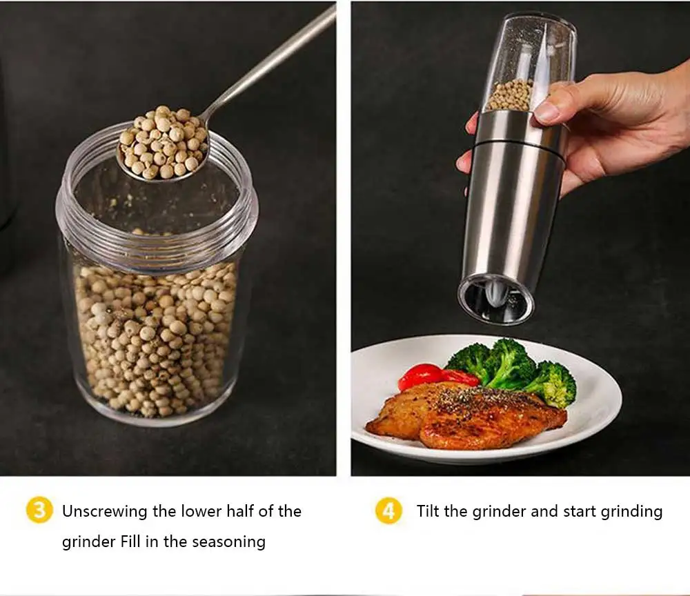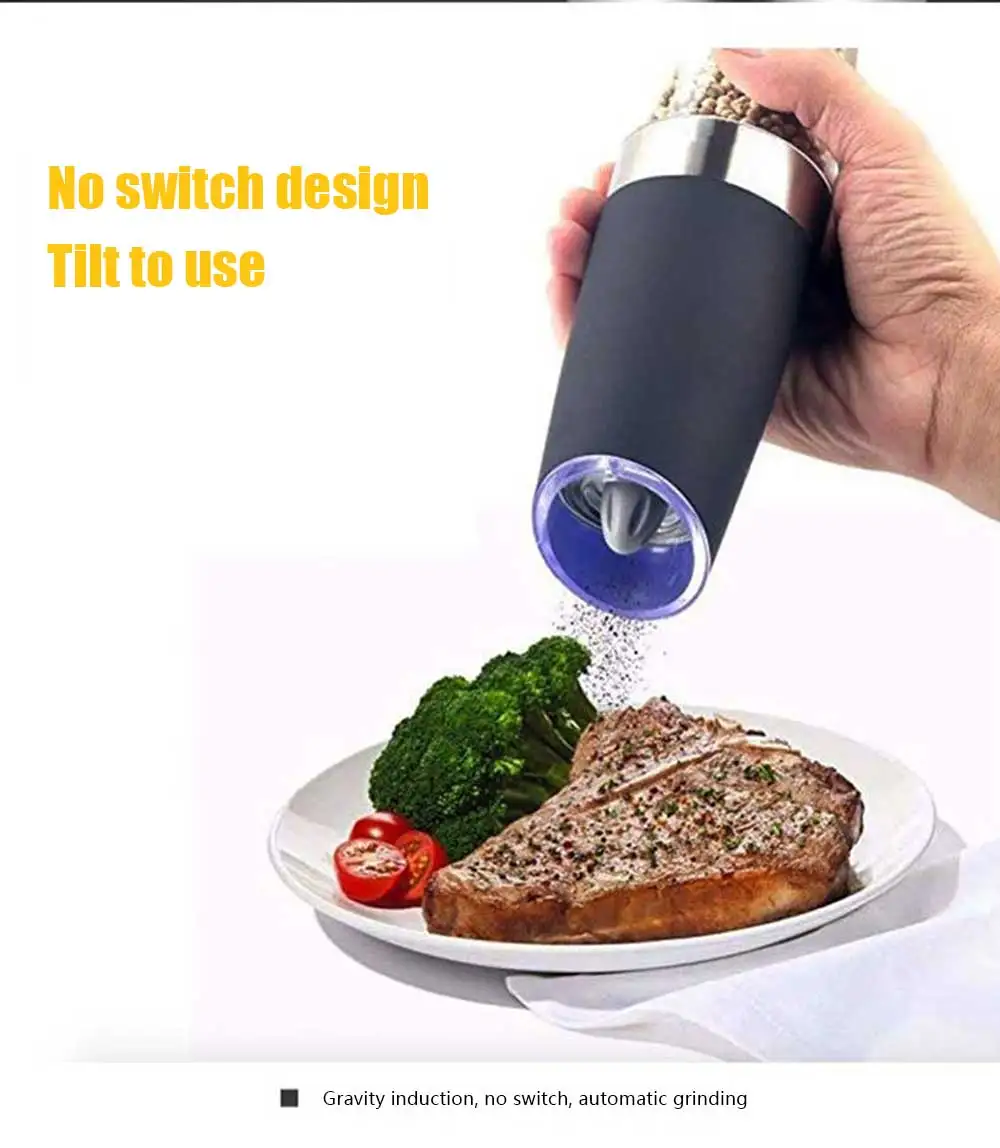 1. Гравитационная работа-просто переверните шлифовальную машину, а затем она будет автоматически измельчать соль и приправы, и синий светодиодный светильник также будет активирован, что весело, креативно, удобно и легко.