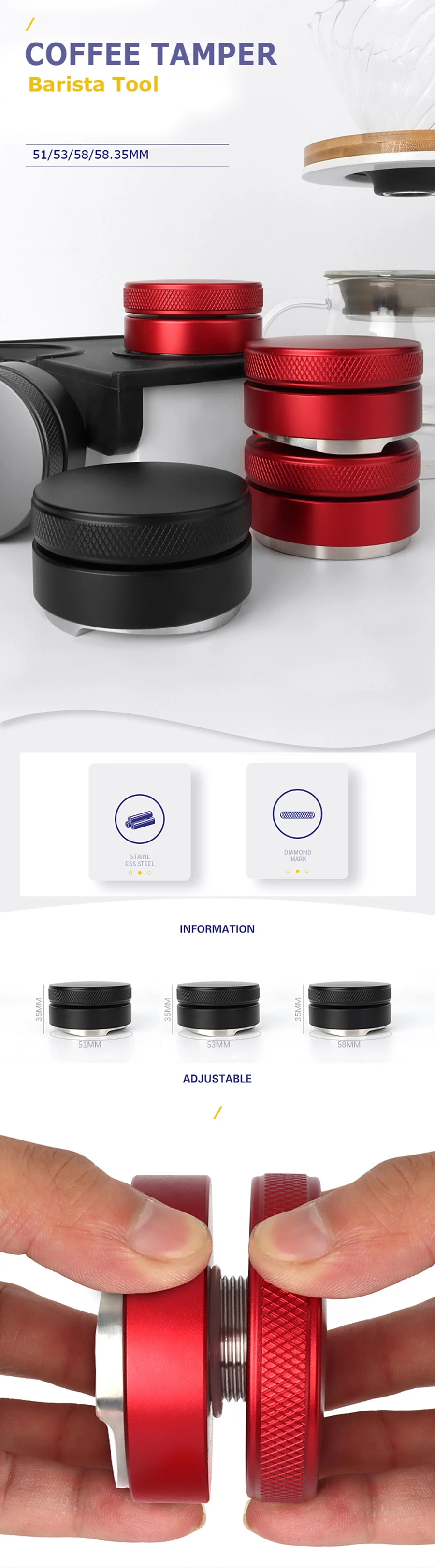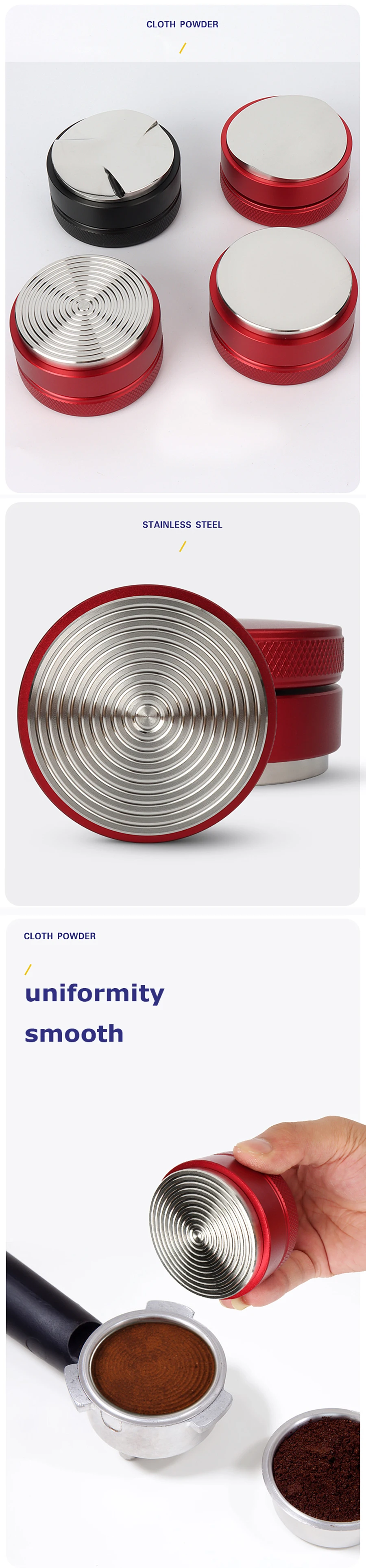 Продукт: кофе тампер Тип: три основания/плоское основание/основание резьбы/плоское основание Материал: алюминиевая ручка 304 основание из нержавеющей стали Посылка с размером 1 кофемолка 51 мм/53 мм/58 мм
