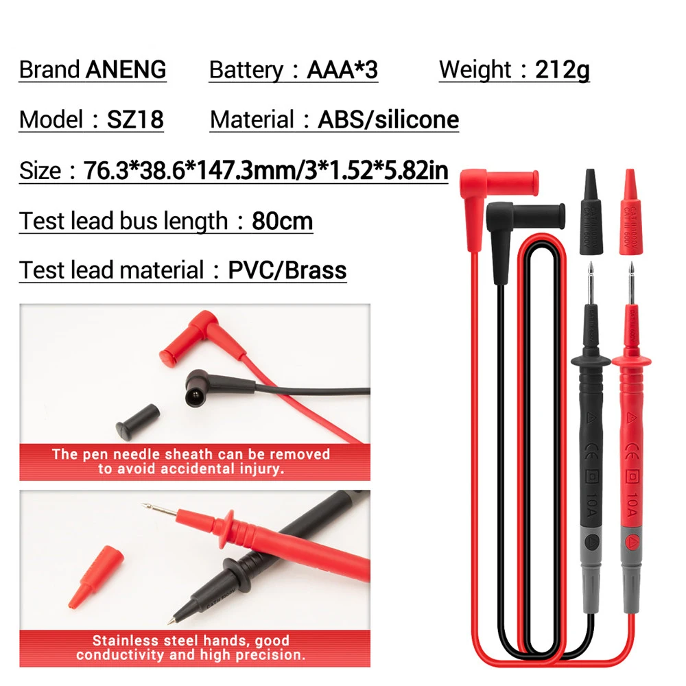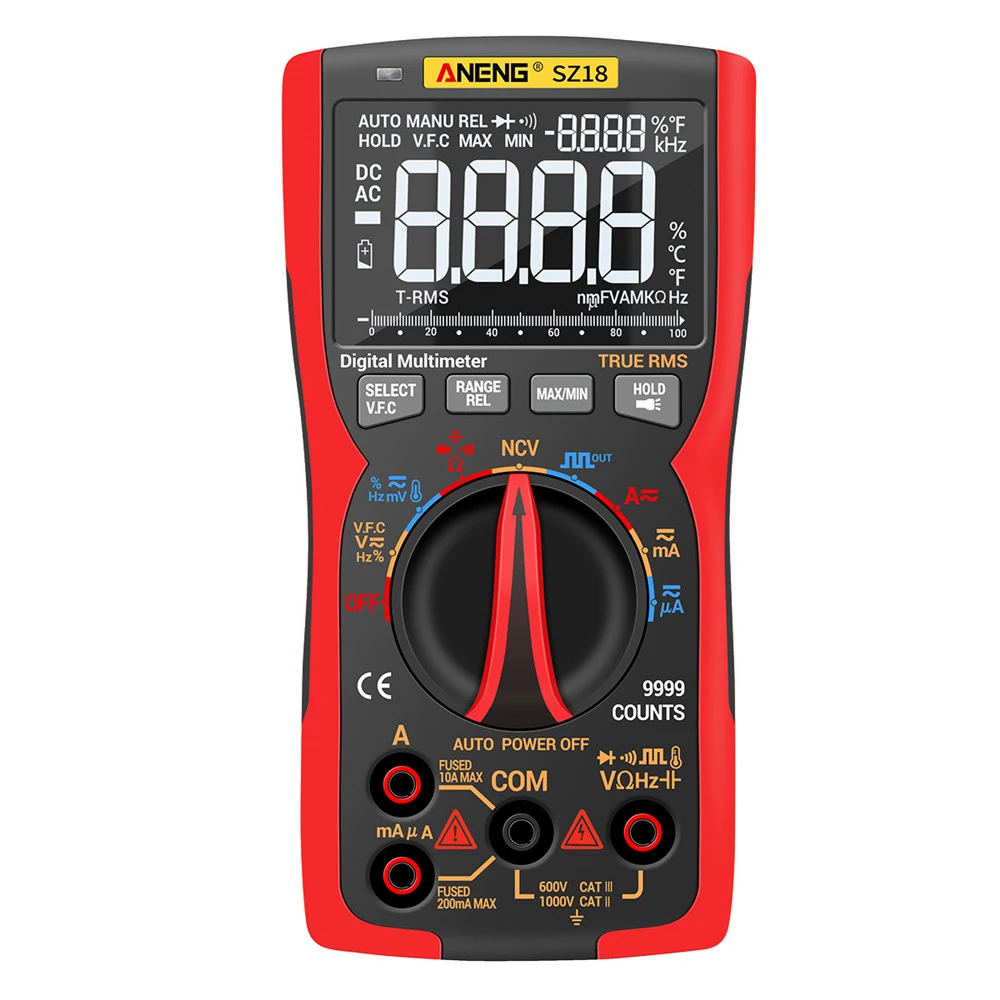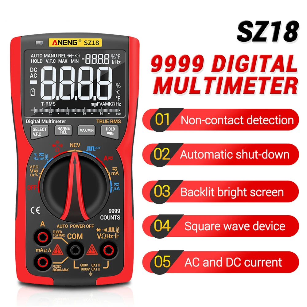 SZ18-это Автоматический диапазон DMM с 9999 словами с истинным эффективным значением. Прибор полностью работает с тройным дисплеем. Измеряет напряжение переменного тока и напряжение постоянного тока Измерение переменного и постоянного тока Измерение сопротивления/температуры Тест на диод и непрерывность Измерение емкости/NCV Измерение частоты и рабочего цикла Обнаружение напряжения переменного тока с защитой от помех Упаковочный лист: 1 * Цифровой мультиметр ANENG SZ18 2 * Тестовый Кабель 1 * термопара 1 * Руководство пользователя 1 * тканевый мешок (по выбору) 1*16 в 1 комбинированная линия (по выбору)