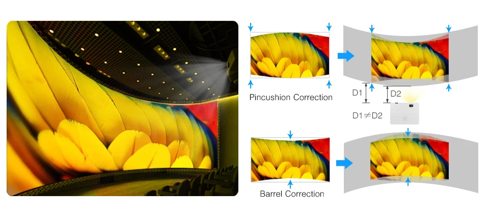 Поскольку чем дальше Расстояние проекции, тем больше изображение проекции, а также различное расстояние между проектором и каждой точкой проекционного экрана arc, форма проекционного изображения станет подушечкой или бочкой, коррекция pincushion/barrel идеально решает эту проблему.