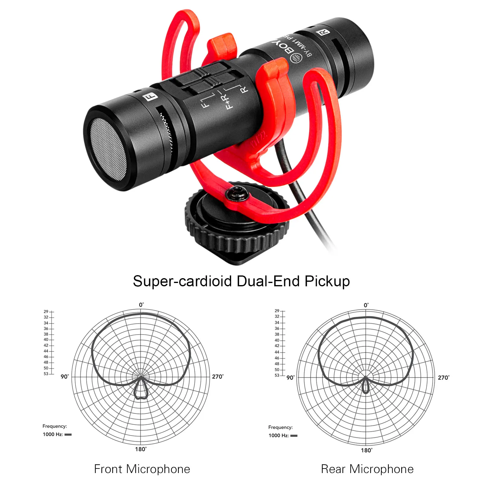 Двойной головной микрофон с 3,5 мм контроля:BOYA BY-MM1 PRO на штативе и микрофона видеокамеры функции двойной конец Звукосниматель в одном, передний/задний/спереди и сзади 3 пикап Режимы легко взаимозаменяемы, бумажное полотенце, кабель для наушников для мониторинга в реальном времени доступен с 3,5 мм портом.