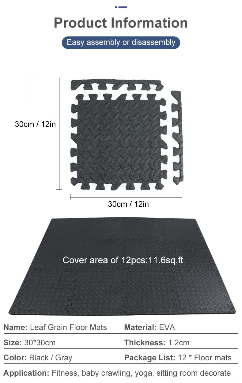 EVA лист зерна коврикиОбнимаем И падаем · украшение для дома · Йога фитнес Не знаю, сколько стоит купить?Количество предметов, которые необходимо приобрести = площадь спальни ÷ Одноместный коврик1. Может использоваться всей семьейВзаимодействие родителей и детей, йога фитнес2. Летняя теплоизоляцияИзоляция холода и влаги зимой3. Легко чиститьПоверхность водонепроницаемая и противообрастающая.Примечание:Не используйте масляные ручки или цветные ручки для нанесения, в противном случае отметки не могут быть вытерты.4. Противоскользящая текстураТекстура листьев, не скользит на ногеНескользящая Текстура на поверхности, более удобная на ощупь.5. АмортизацияТолстая, амортизация и высокая устойчивость6. Конструкция блокировкиПростой дизайн с зигзагом, простое и бесшовное соединение, легко разбирается, различные формы. Информация о продукте Площадь покрытия 12 шт: 11,6 кв. ФутовНаименование: напольные коврики с листьямиМатериал: ЭВАРазмер: 30*30*1,2 см/12*12*0,47 дюймовРазмер упаковки: 30*30*14,4 см/12*12 * 5.67inЦвет: черный/серыйПосылка: 12 * коврикиПрименение: фитнес, ползание ребенка, Йога, украшение для гостиной Примечание:1. После длительного периода герметичной транспортировки на первом отверстии может быть слабый запах, который может быть устранен через несколько дней в проветриваемом месте.2. Для ручного измерения допускается зазор в 1-3 мм.