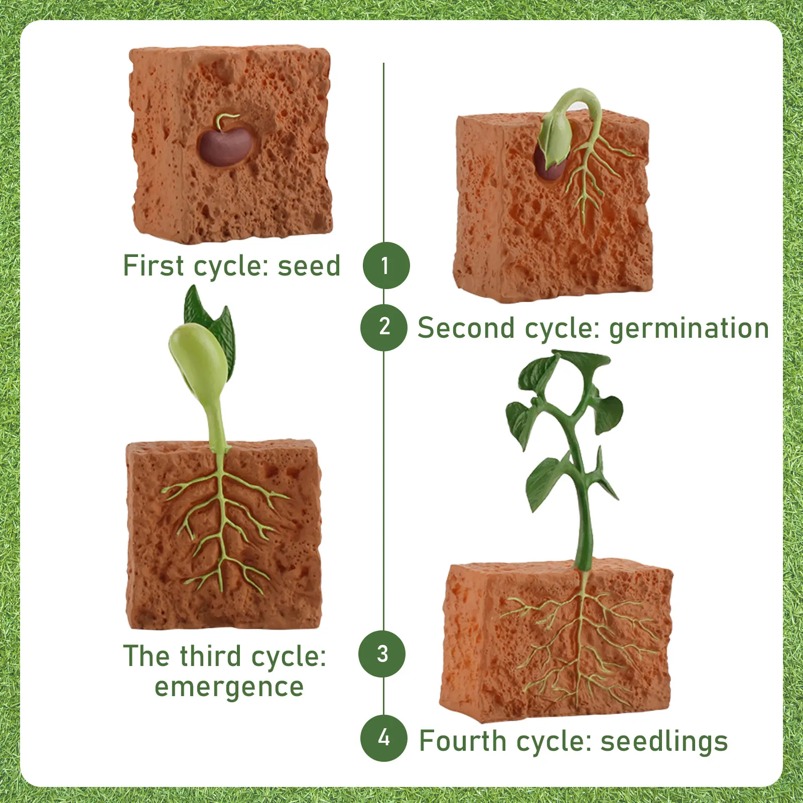 Детали: Функция: эти фигурки жизненного цикла семян показывают детям процесс роста растений фасоли от семян, проращивания, рассады до растений простым, практичным и интересным способом. Реалистичные детали: с моделируемой формой и цветом, позволяет детально изучать рост природы на каждом этапе, чтобы они могли научиться наблюдать за растениями в реальной жизни. Безопасный материал: изготовлены из нетоксичного материала АБС-пластика, не содержащего Бисфенол А, безопасного для детей, эти фигурки жизненного цикла семян можно любоваться, демонстрировать, трогать и играть. Развивающие игрушки: Развивайте воображение и творческие способности ваших детей по мере обучения через живые занятия. Также отлично подходит учителям лекции учебного материала природы. Идеальный подарок: хороший выбор подарка для детей на день рождения, Рождество, праздники и т. Д.; Отлично подходит для сказочного рассказа, обучения, школы, ролевых игр, презентаций, игр и так далее. Спецификация: Материал: ABS Размер: Семя: 3,5x3,5 см/1,38x1,38 дюйма Пророщенное семя: 3,5x4,2 см/1,38x1,65 дюйма Рассада: 3,5x6,7 см/1,38x2,64 дюйма Растение: 5,3x9,3 см/0,09x3,66 дюйма Примечание: Из-за ручного измерения возможны небольшие отклонения. Комплектация: 1 Набор фигурок жизненного цикла (4 шт.)