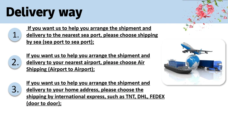 (1) Если вы хотите, чтобы мы помогли вам организовать доставку и доставку в ближайший морской порт, пожалуйста, выберите доставку по морю (морской порт в морской порт); Если вы хотите, чтобы мы помогли вам организовать доставку и доставку в ближайший аэропорт, пожалуйста, выберите авиадоставку (аэропорт в аэропорт); Если вы хотите, чтобы мы помогли вам организовать доставку и доставку по вашему домашнему адресу, пожалуйста, выберите доставку международной экспресс-почтой, такой как TNT, DHL, FEDEX (от двери до двери); Заводская цена означает, что не содержит стоимость доставки. (2) Если вы выбираете воздушную/международную экспресс-доставку, хладагент будет удален перед отправкой, потому что он запрещен на самолете. Поэтому вам нужно заполнить хладагент перед использованием, более подробную информацию, мы сообщим вам, как только машина будет получена. (3) Если вы выбираете Бесплатную доставку по морю, наше предложение основано на торговых условиях CNF! Это означает, что после прибытия в порт назначения покупатель должен оплатить стоимость порта назначения (например, плату за обработку терминала, плату за документ, плату за хранение и т. д.), налог, чтобы сделать таможенное оформление и забрать товары. (4) после длительного времени транспортировки, очевидно, вызовет обратную подачу хладагента и другие феномены, Если Новая покупка жареной машины льда должна была лететь, компрессор может сгореть. Поэтому, пожалуйста, положите новую машину на пол 12 часов перед использованием. (5) покупатели должны тщательно проверить упаковку/товар перед подписанием получения товара. Если есть какие-либо повреждения, пожалуйста, свяжитесь с вашим местным TNT / DHL / Fedex, чтобы сделать жалобы и жалобы или свяжитесь с нами С нами в течение 24 часов.(niu)