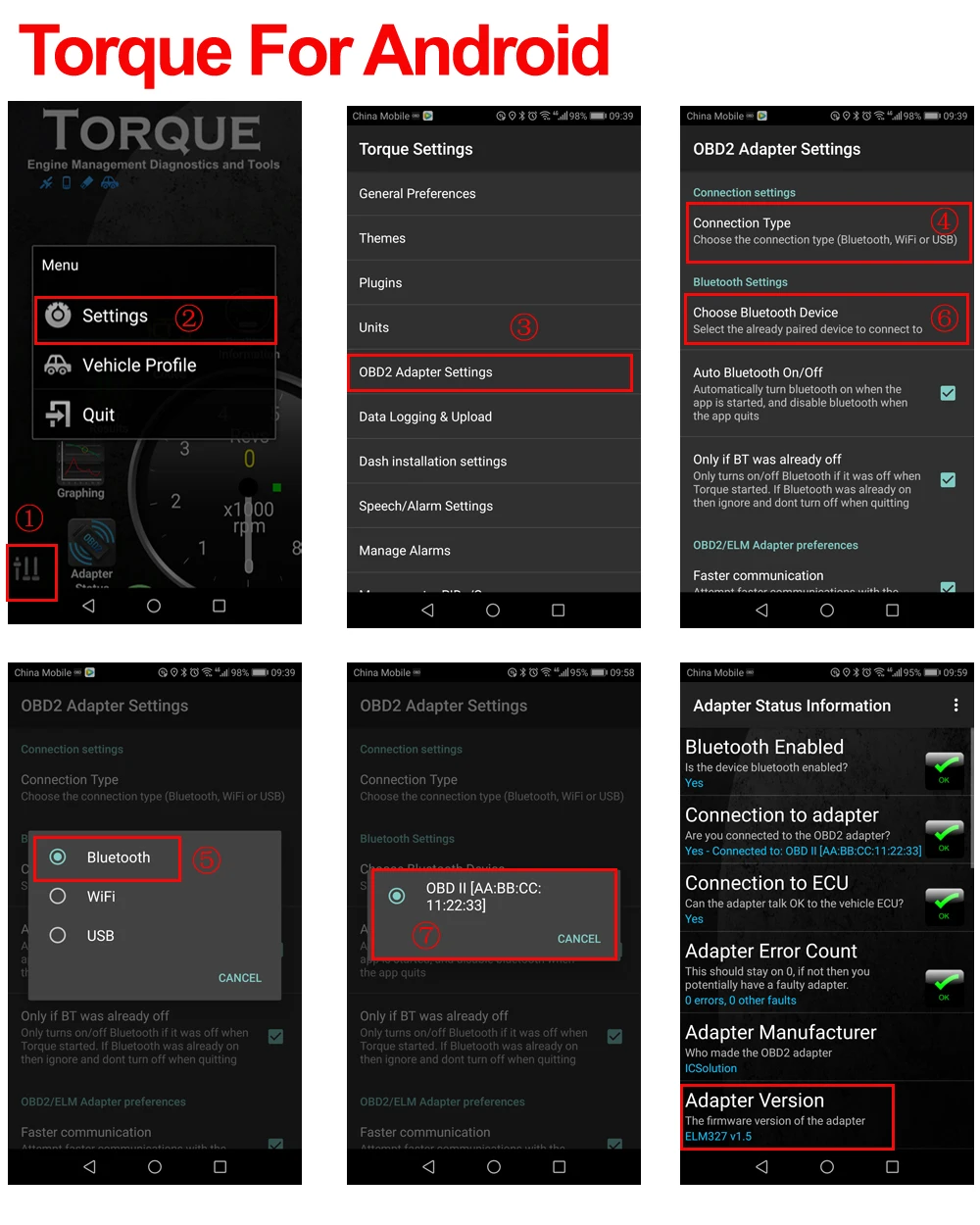 Решение: 1. Выйдите из программного обеспечения и введите его снова 2. Откройте «Настройки» вашего android и найдите bluetooth «OBD II» от ELM327, затем введите пароль 1234 3. Откройте крутящий момент-Настройка-настройки Адаптера obd2-Тип подключения-bluetooth-назад-Выберите bluetooth-устройство-obdii[AA:BB:CC:11:22:33]