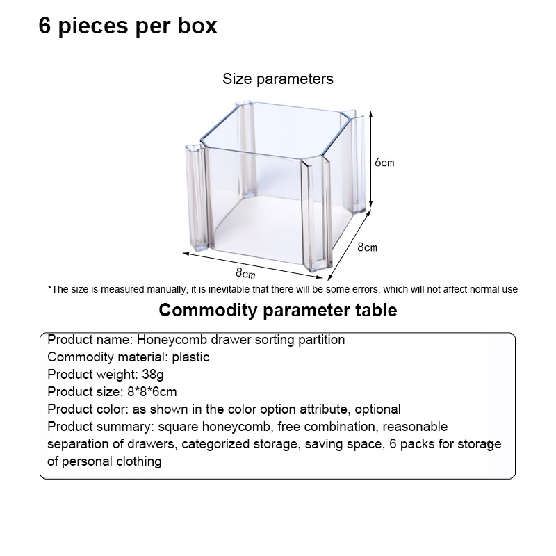 *Product summary: square honeycomb, free combination, reasonable separation of drawers, categorized storage, saving space, 6 packs for storage of personal clothing.
