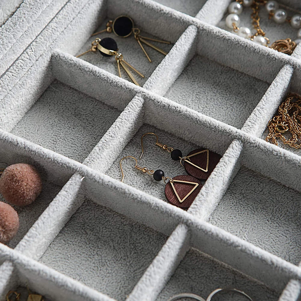 Съемные разделители обеспечивают максимум 12 или 24 секционных отсеков. Размер каждого отсека может быть скорректирован путем удаления разделителей для хранения ювелирных изделий и аксессуаров различных размеров.