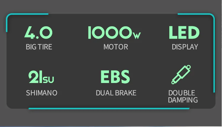 Это может быть сделано в крупных странах и регионах мира Большие шины: 4,0 Двигатель: 1000 Вт Светодиод: дисплей Shimano:21su Двойной тормоз: EBS Передняя подвеска: пружинное Демпфирование