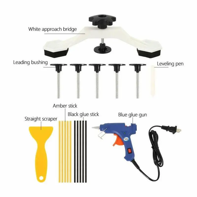* Многофункциональный, этот комплект для ремонта кузова автомобиля включает в себя мостовой съемник, 5 шт. разных клеевых вкладок, 10 шт. клеевых палочек, тепловые Клеевые пистолеты, лопатка для клея, всего 18 шт. С помощью этого набора Вы можете отремонтировать различные размеры вмятин и вмятин на вашем автомобиле, автомобиле, мотоцикле, грузовике. Многофункциональный клеевой пистолет не может быть использован™Устройство для удаления вмятин, но также может быть использовано ручной работы и дома DIY проектов