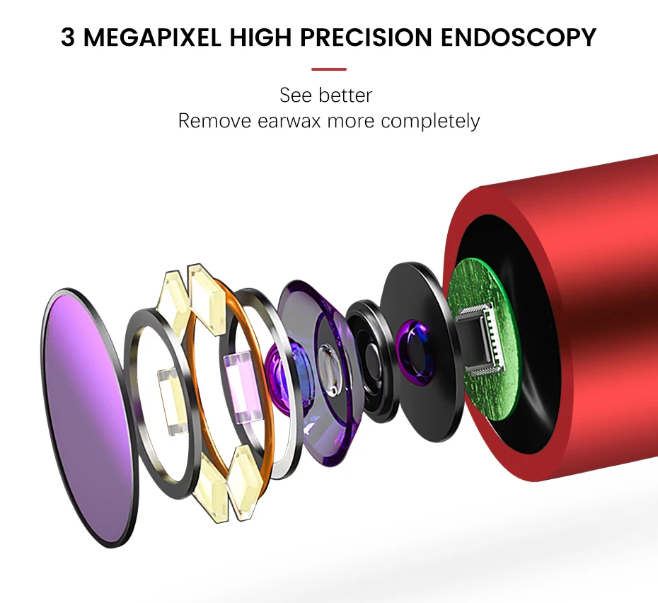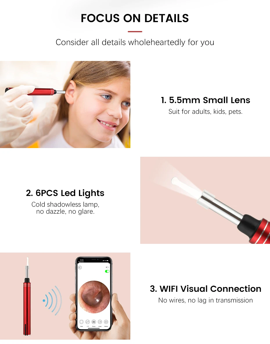 1. Камера эндоскопа имеет 6 светодиодный светильник s вокруг наконечника, чтобы светильник в любой области, которую вы хотите увидеть, поможет вам лучше видеть и удалить ушной воск более полностью и безопасно в условиях темного или низкого светильник.