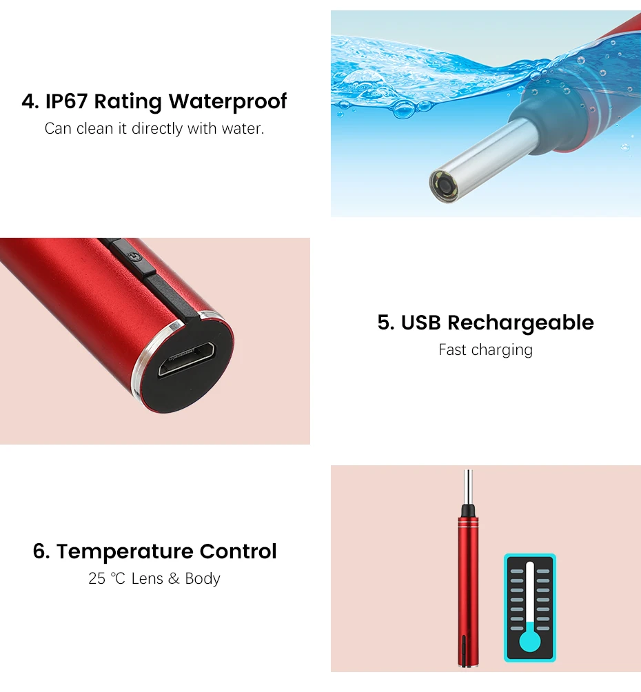 5. Этот зонд имеет степень водонепроницаемости IP67, поэтому вы можете очистить его непосредственно водой. Это также позволяет сохранять фотографии и видео, вы можете отправить их профессионалу для быстрой и легкой консультации.
