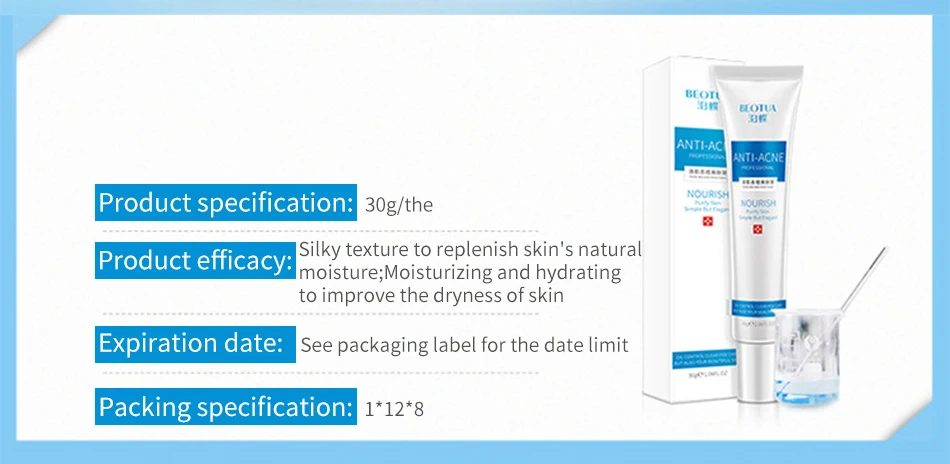 Бренд: BEOTUA Вес нетто: 30 г Тип кожи: для любой кожи Срок годности: 3 года Основные ингредиенты: 100% растительная эссенция коллаген ментол Гиалуроновая кислота Функции: очистка. Удаление масла для кожи. Очищение. Питательный. Крем для Oil-control.Acne лечения. Акне. Акне marks.mo истуризация. Предотвращение окклюзии пор. Деликатное лечение акне. Экстракт авокадо. Водный и масляный баланс. Гиалуронат натрия. Особенности: С нежной текстурой, конечный раствор балансирует воду и масло и быстро и легко избавляется от acnes, не высушивая кожу, делая вашу кожу мягкой и гладкой. Способ применения 1. Эффективно очищает кожу лица 2. Равномерно нанесите необходимое количество продукта на acnes 3. Мягко массируйте круговыми движениями для улучшения поглощения кожи Забота о коже: потому что характеристики кожи каждого человека различаются, поэтому адаптивность различных средств по уходу за кожей отличается, в использовании любого нового продукта по уходу за кожей. Рекомендуется использовать кожу уха, чтобы проверить продукт. При возникновении дискомфорта или аномальной реакции кожи. Тогда рекомендуем не использовать его. Посылка включает в себя: 1 xBEOTUA дневной крем