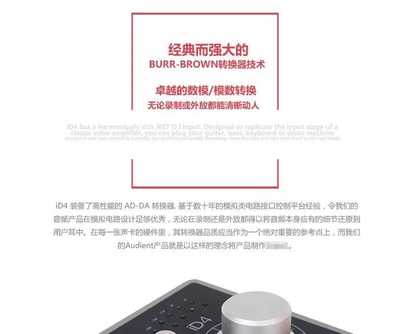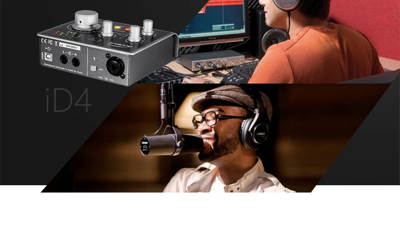 Audient ID4 High Performance USB Audio Interface iD4 delivers the audio performance of a large format console in a portable desktop package. Providing one renowned Audient console mic pre, class-leading converter technology, two headphone inputs, console style monitor control, JFET D.I and our virtual scroll wheel technology 'ScrollControl', iD4 is a professional but affordable solution for your home studio or for when you’re on the road. WORLD CLASS MIC PRES The professional sound you deserve We are the only company that use the same Class-A mic pre design throughout our entire product range, whether you’re in the studio with an Audient console or on the road with iD4, you’re always guaranteed the same world class Audient sound.