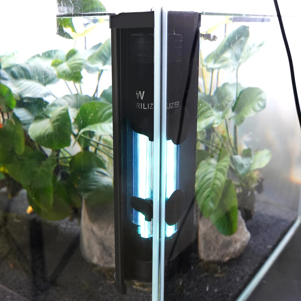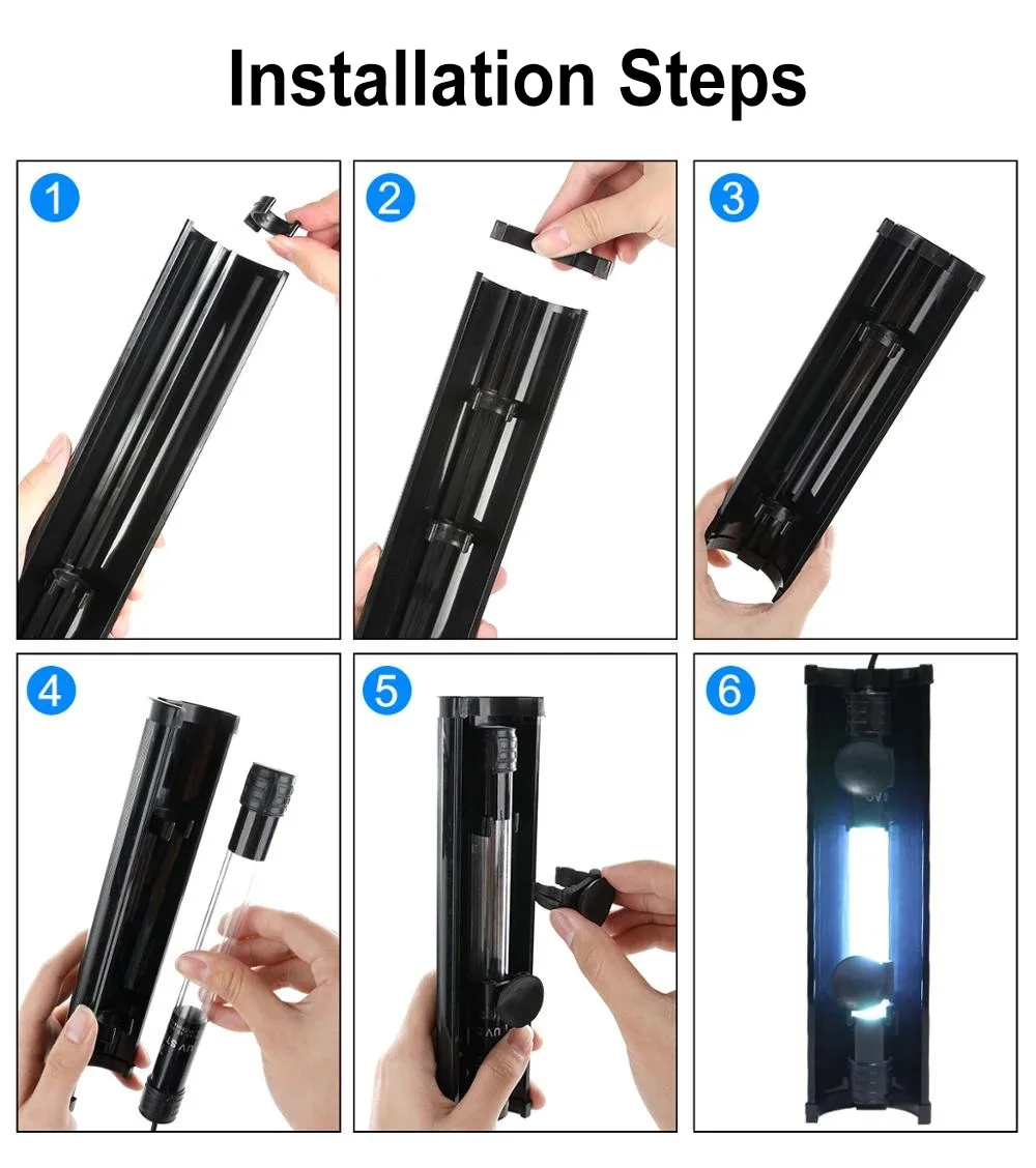 1. Соберите УФ-светильник для аквариума. 2. Пристегните аквариумный УФ-стерилизатор в присоске на светильник и положите на присоске. 3. Поместите аквариумные УФ стерилизатор с UV светильник капюшон в фильтр коробки и сосать ее на стену.