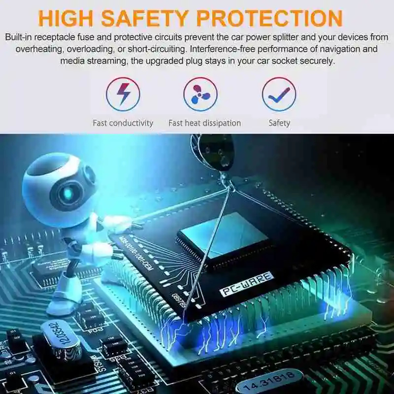 Высокая безопасность: Встроенный предохранитель и защитные цепи предотвращают перегрев, перегрузку или короткое замыкание автомобильного разветвителя питания и ваших устройств. Безинтерференционная производительность навигации и потоковой передачи данных, обновленная вилка надежно остается в вашей автомобильной розетке.