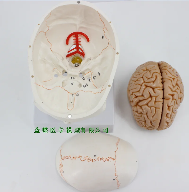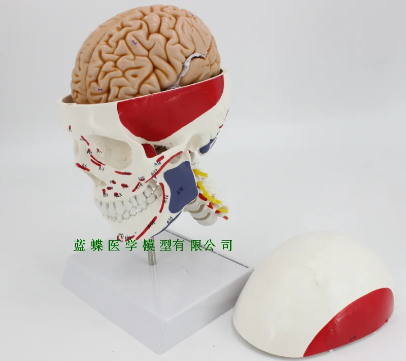 功能特点:本模型由头骨和 7 节颈椎组成,带颈椎动脉,活动下巴.可打开的头盖骨和可拆卸的下巴并标注肌肉着色编码,有底座.