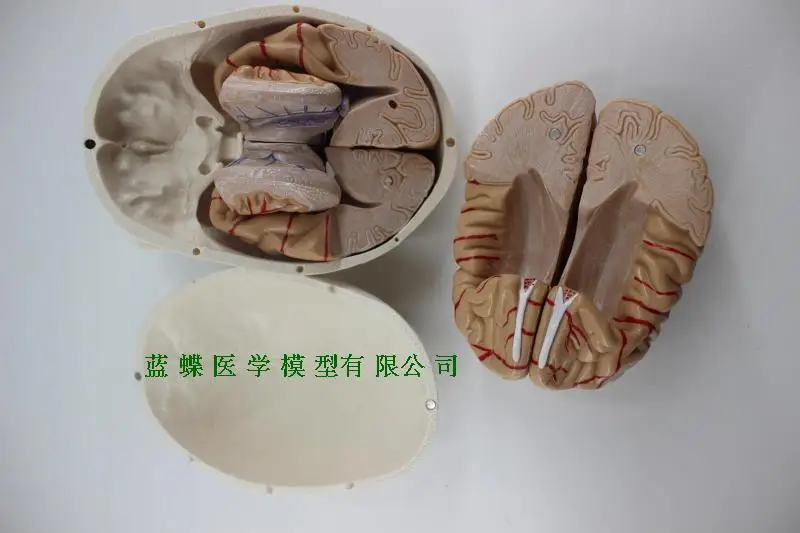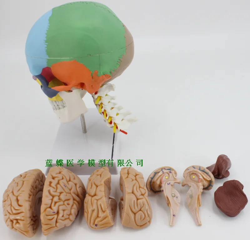 此款模型采用 19 种豪华色彩来展现头颅各种骨片的形状和关联.В1. 展示的是菱脑.脊髓.颈神经.椎动脉.基底动脉和后脑动脉. 高质量的原型 用坚固不碎的硬塑料手工制成 高度精确地展示了小脑沟.孔.突.骨缝等 可分拆成颅盖.颅底和下颌骨.是研究人体头骨及颈椎结构形态的模具.10х15х26см 10х26 см
